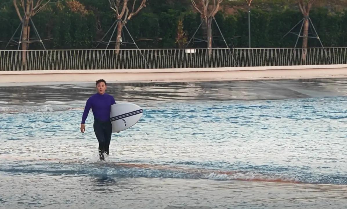 吳謹言的老公洪堯,應該是衝浪老手了。他穿紫色上衣、黑色褲子,自然的抱着衝浪板從遠處走過來。