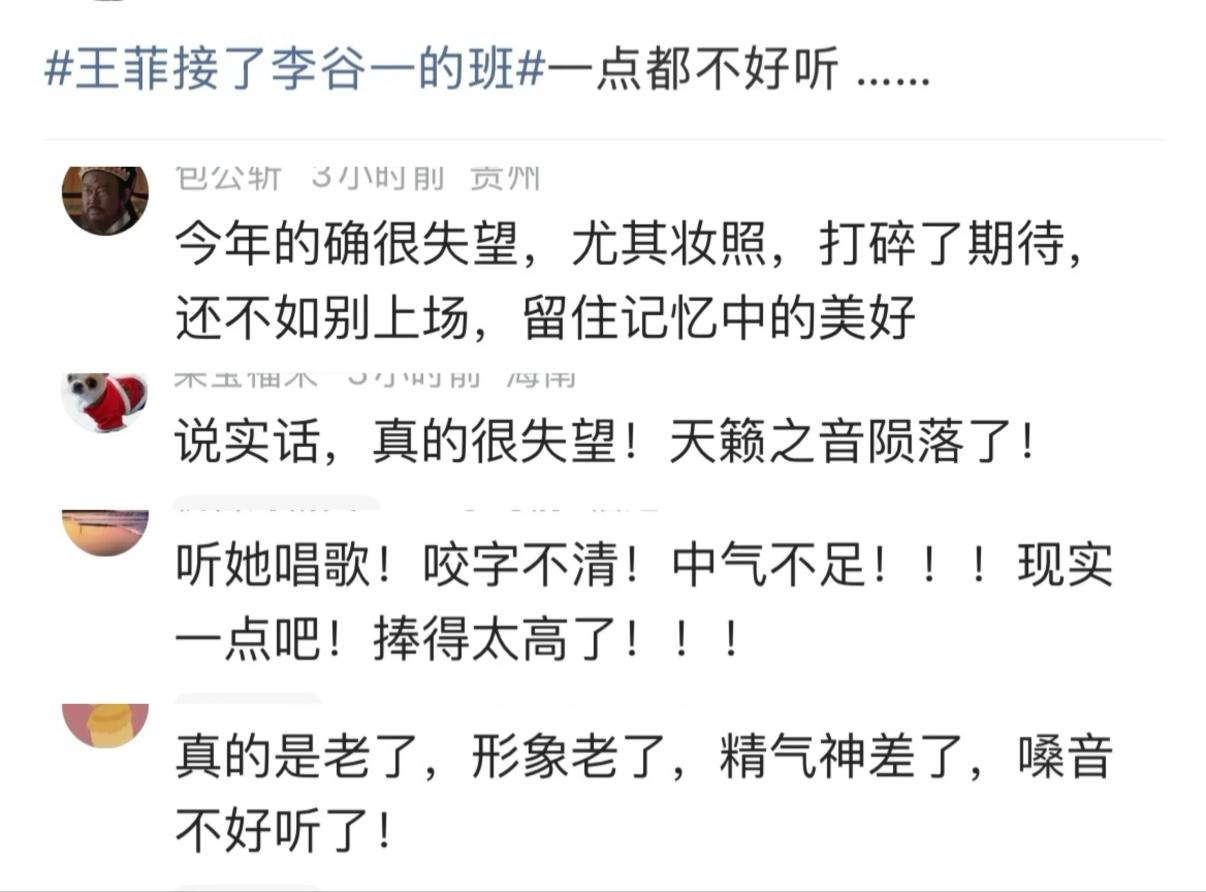 除了妝造,讓觀衆比較失望的還是王菲的歌喉。觀衆評價:打碎了期待,天籟之音隕落了,真的很失望。