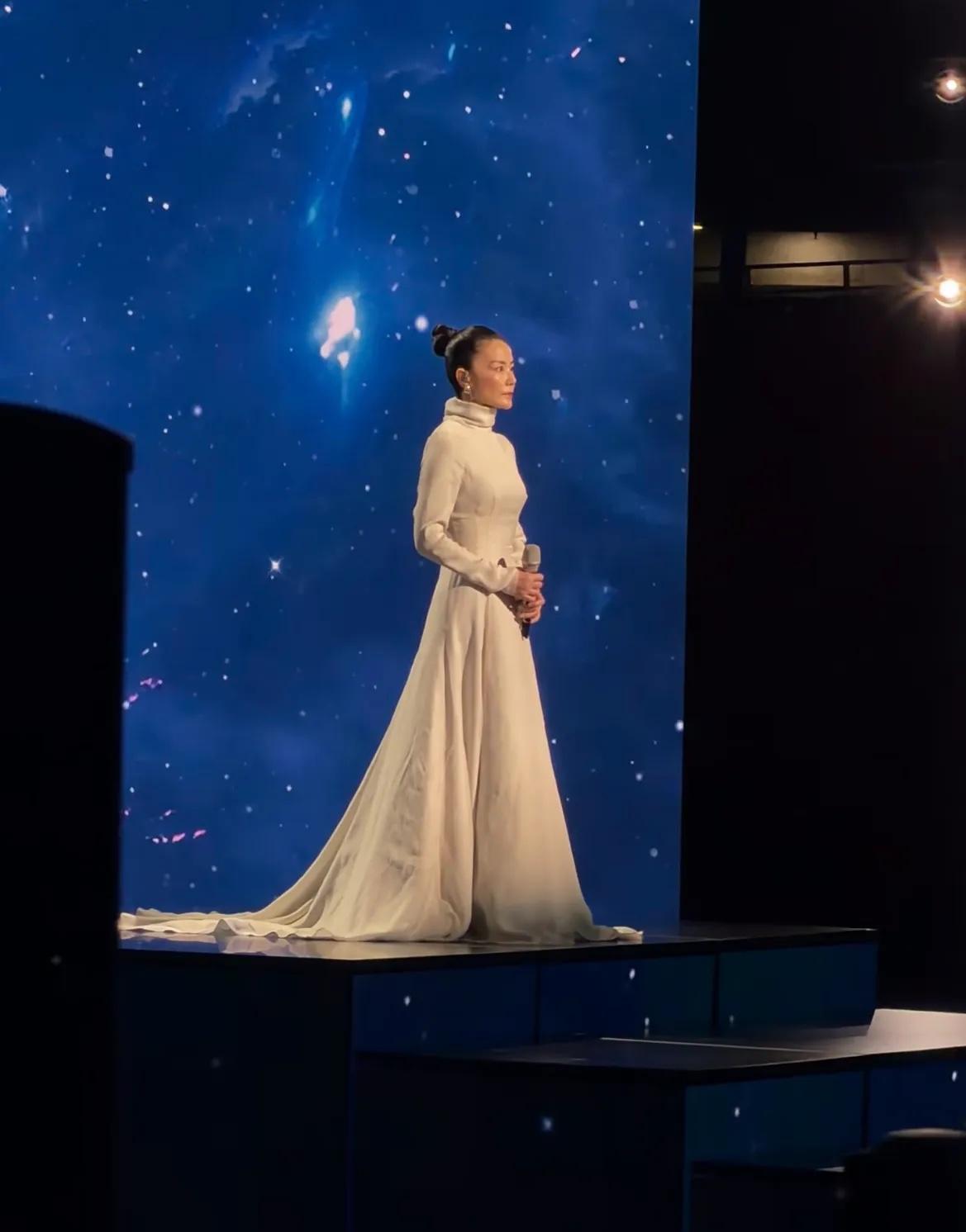 一襲素雅的白裙,裙襬拖地設計非常儒雅。王菲的舞臺感還是很棒,沒有吵鬧的伴舞、是一個人的獨舞臺,星海浩瀚、磅礴大氣。