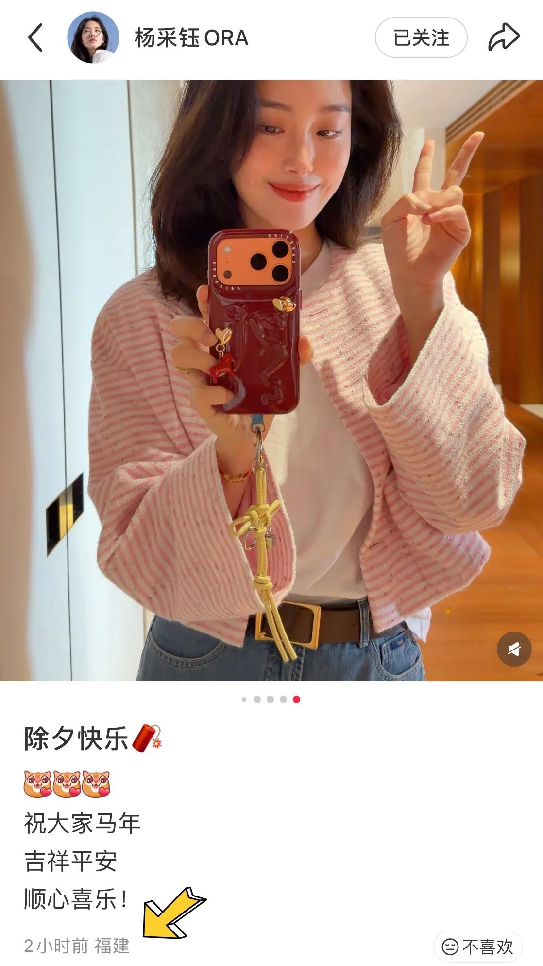 除夕夜的時候,楊採鈺曬了自己的生活動態。她的ip定位在福建,所在的環境富麗堂皇,裝修非常高端奢華,大的像是酒店一樣。看樣子楊採鈺是已經回到自己的婆家過年了。