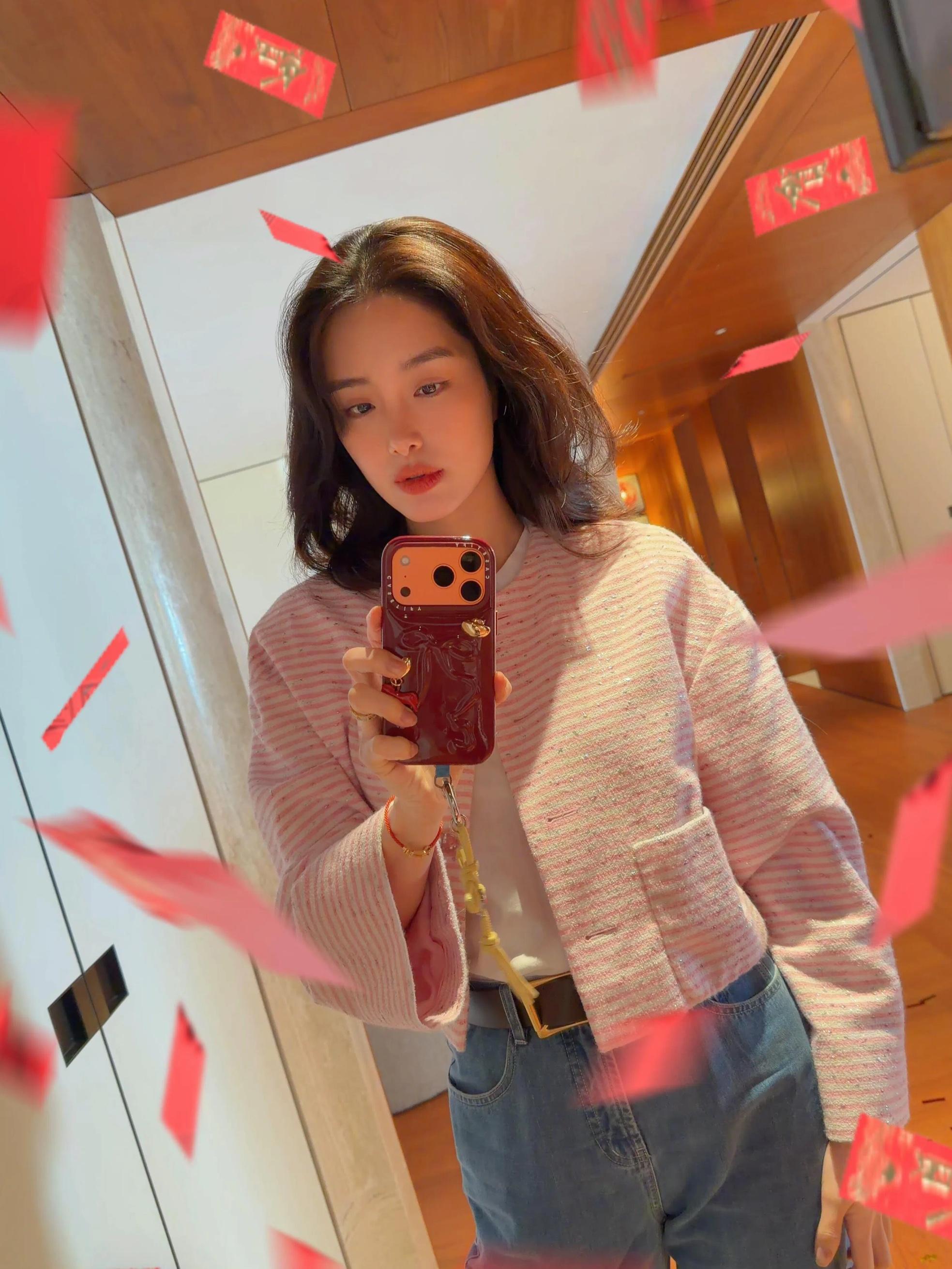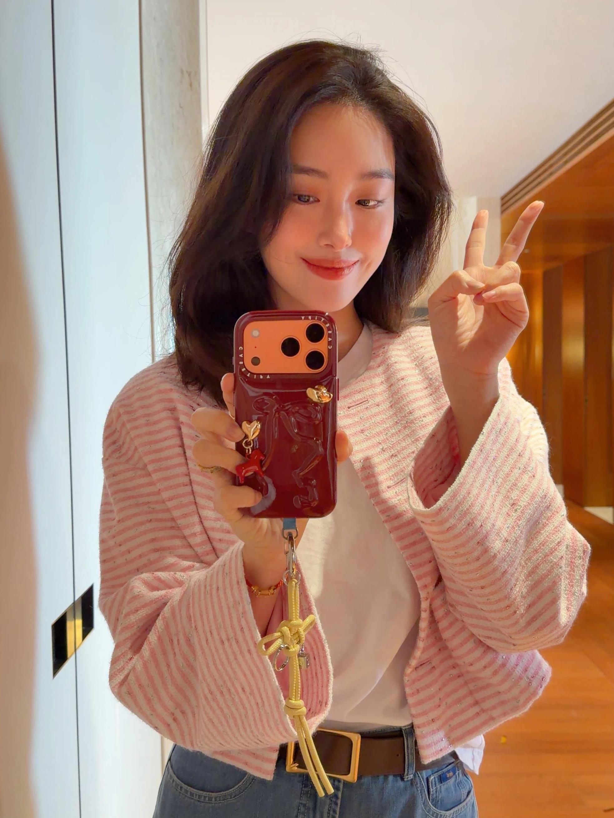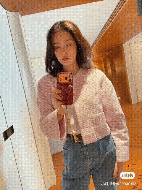 她手裏拿着最新款的水果手機,也是很潮流的愛馬仕橘。微卷分長髮,營造出一種法式風情的優雅,搭配酒紅色手機殼很好看。