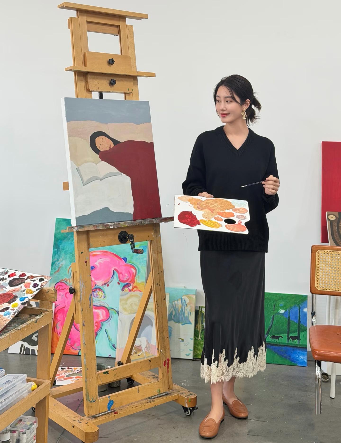 雖然她沒有系統的學過畫畫,但是在繪畫上很有天賦、也有自己的審美,色彩感好、氛圍感強、作品偏生活寫意,技法上相對隨性。