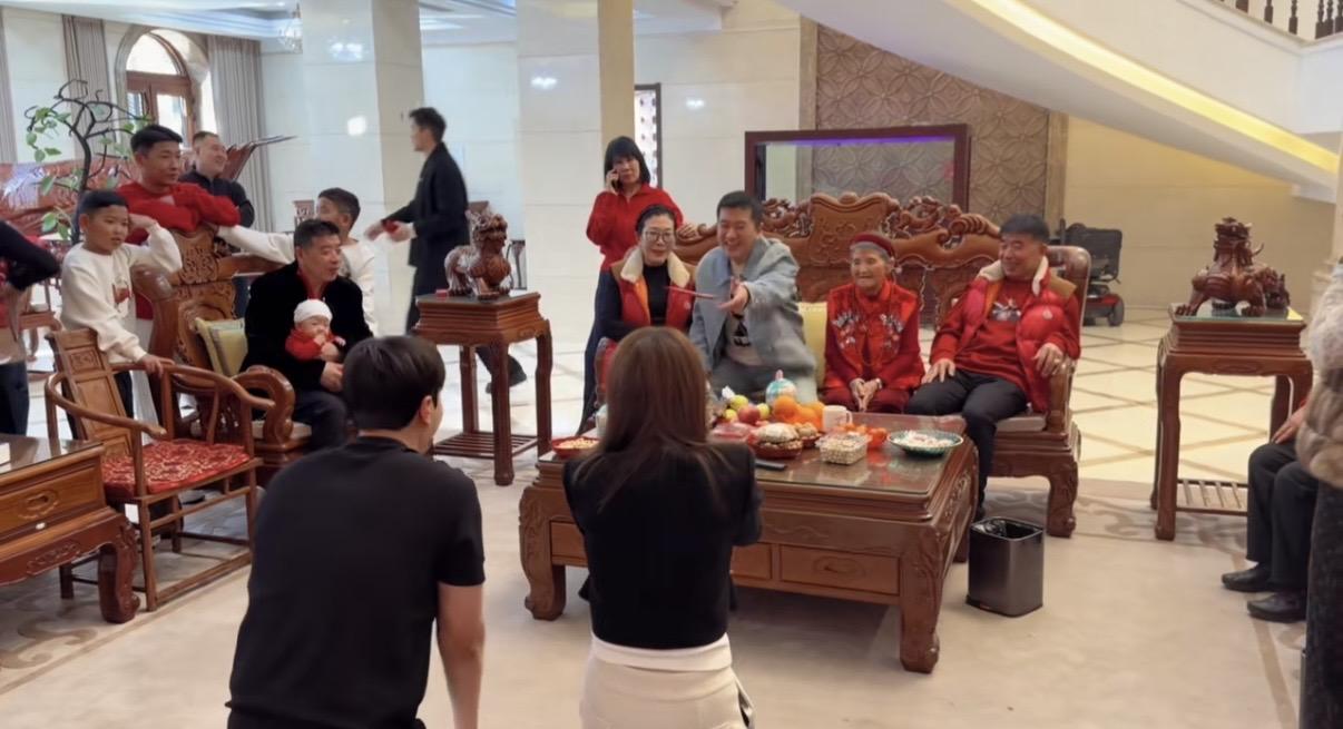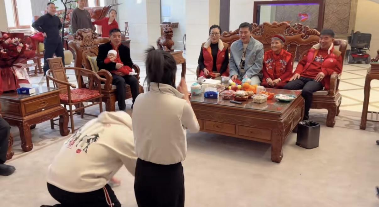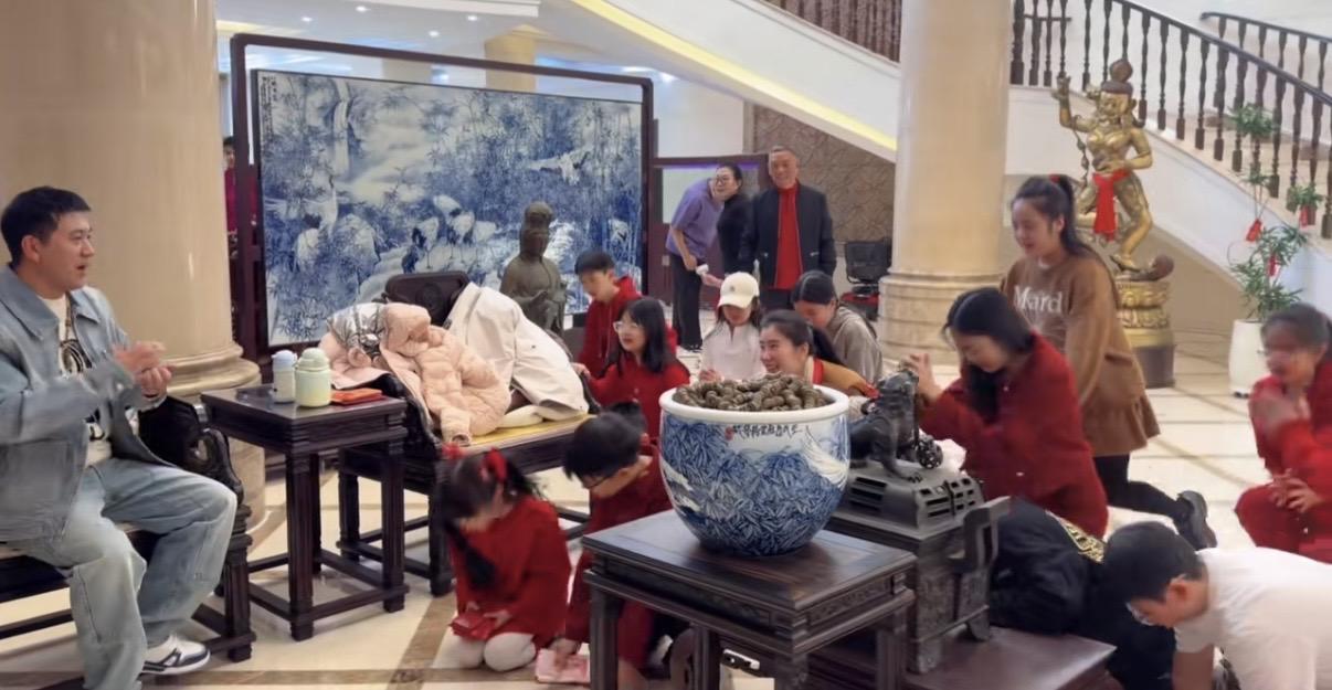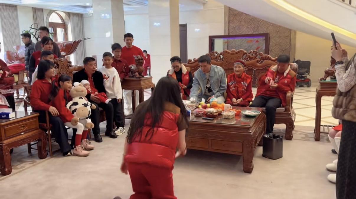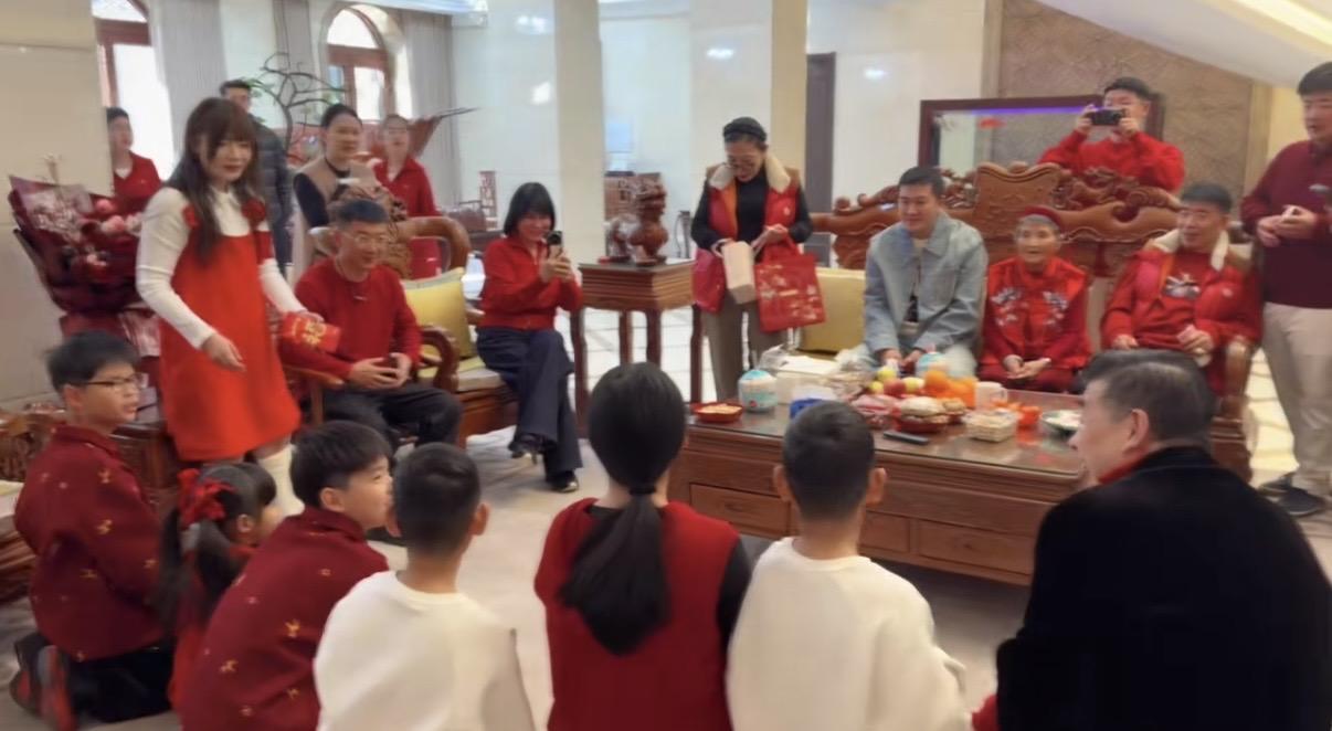 不過當時的場景比較熱鬧,大家都是有說有笑的。孩子們跪地磕頭拜完年之後,楊子機會給孩子們派紅包。