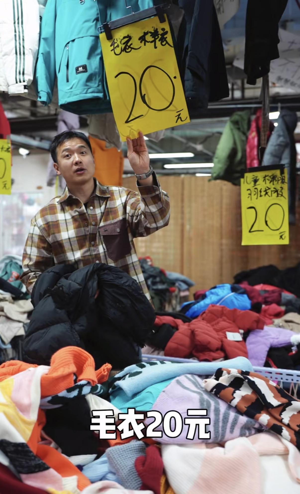 可仔細一看,上面的標籤寫着毛衣樣衣20元,兒童棉服、羽絨服20元,簡直不敢想象,這樣的衣服只要20塊錢,平時哪怕我們在直播間購物,也不止這個價格啊。