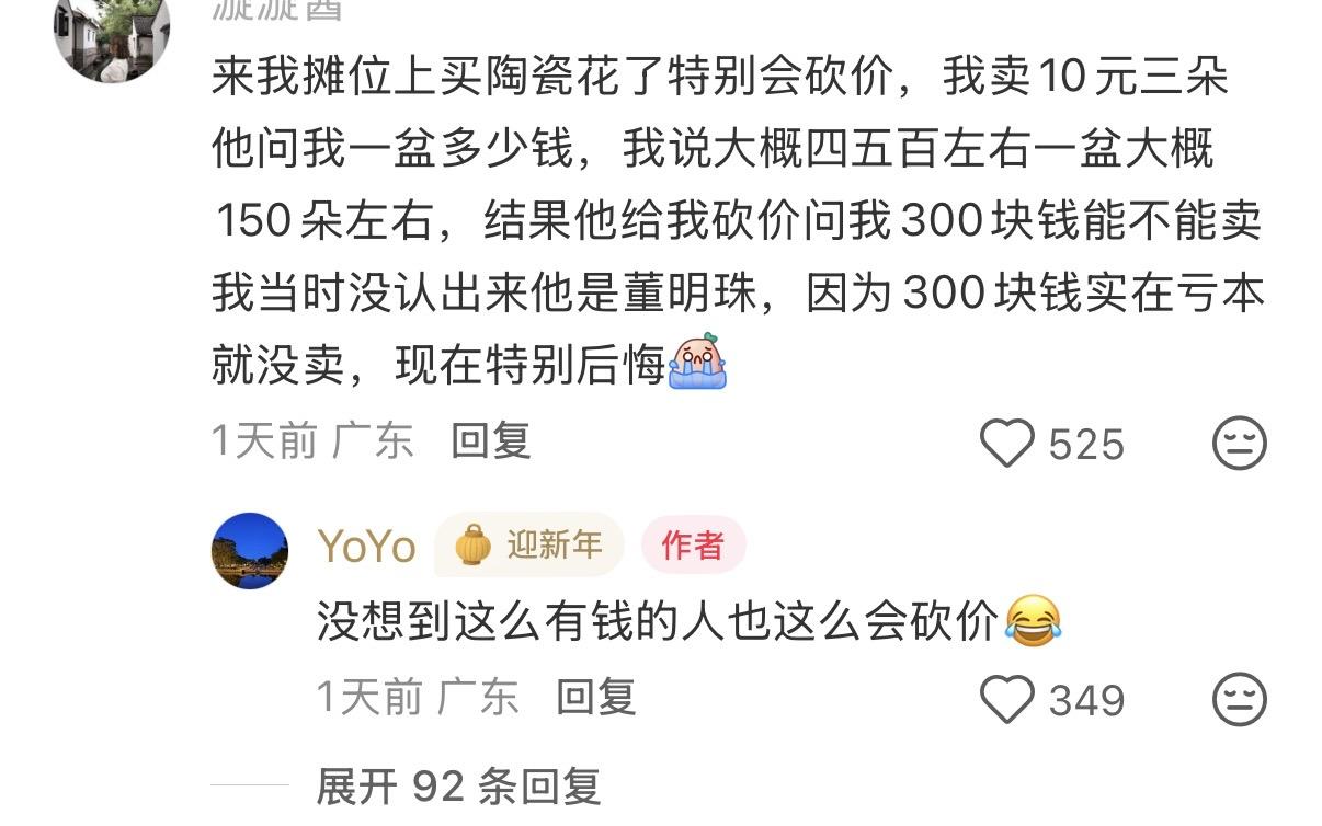 還有網友透露,董明珠來他的攤位上買陶瓷花,特別會砍價。甚至砍價砍得有點狠,一般10元3朵花,董明珠問一盆150朵左右給300塊錢賣不賣。