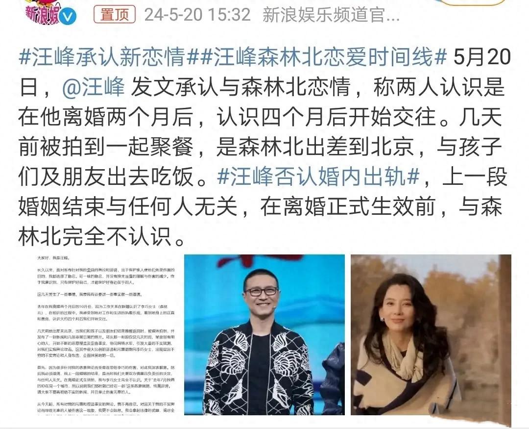 爲了給森林北正名,汪峯特意公開了戀愛時間線。表示兩個人認識是在離婚2個月後,否認了婚內出軌。且在離婚正式生效前,和森林北沒有任何交集,完全不認識。