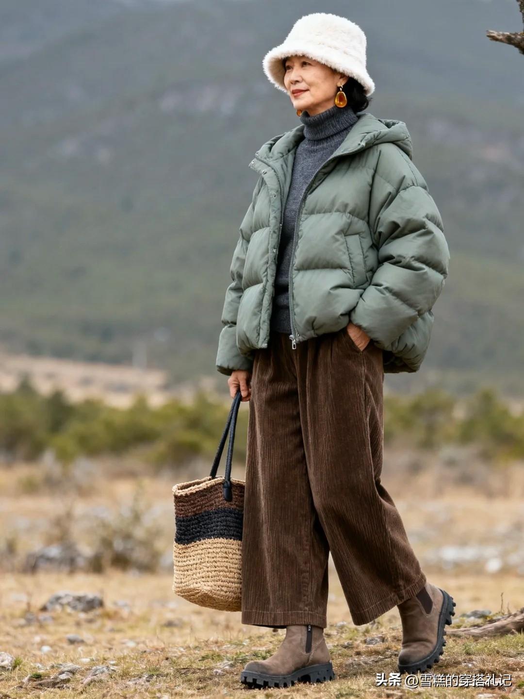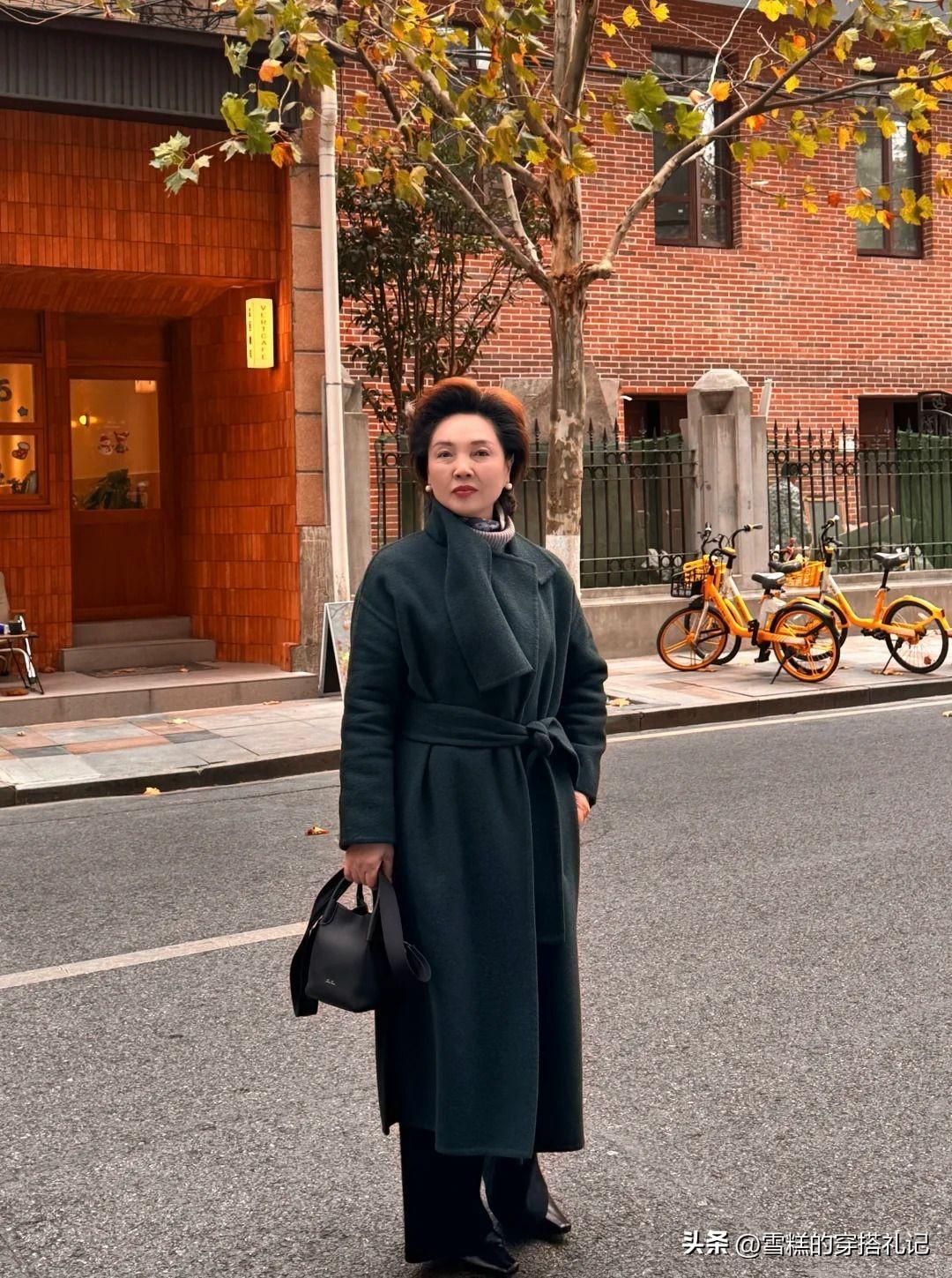 第四種想要給五六十歲女人推薦的穿搭色彩是綠色系。其中表現尤其突出的是松石綠、苔蘚綠、橄欖綠這幾種。它們展現出綠色本身的平和靜氣以外,又融如了低飽和度帶來的內斂和剋制效果,穿在身上不搶眼,與其他淺色系呼應非常沁人心脾。