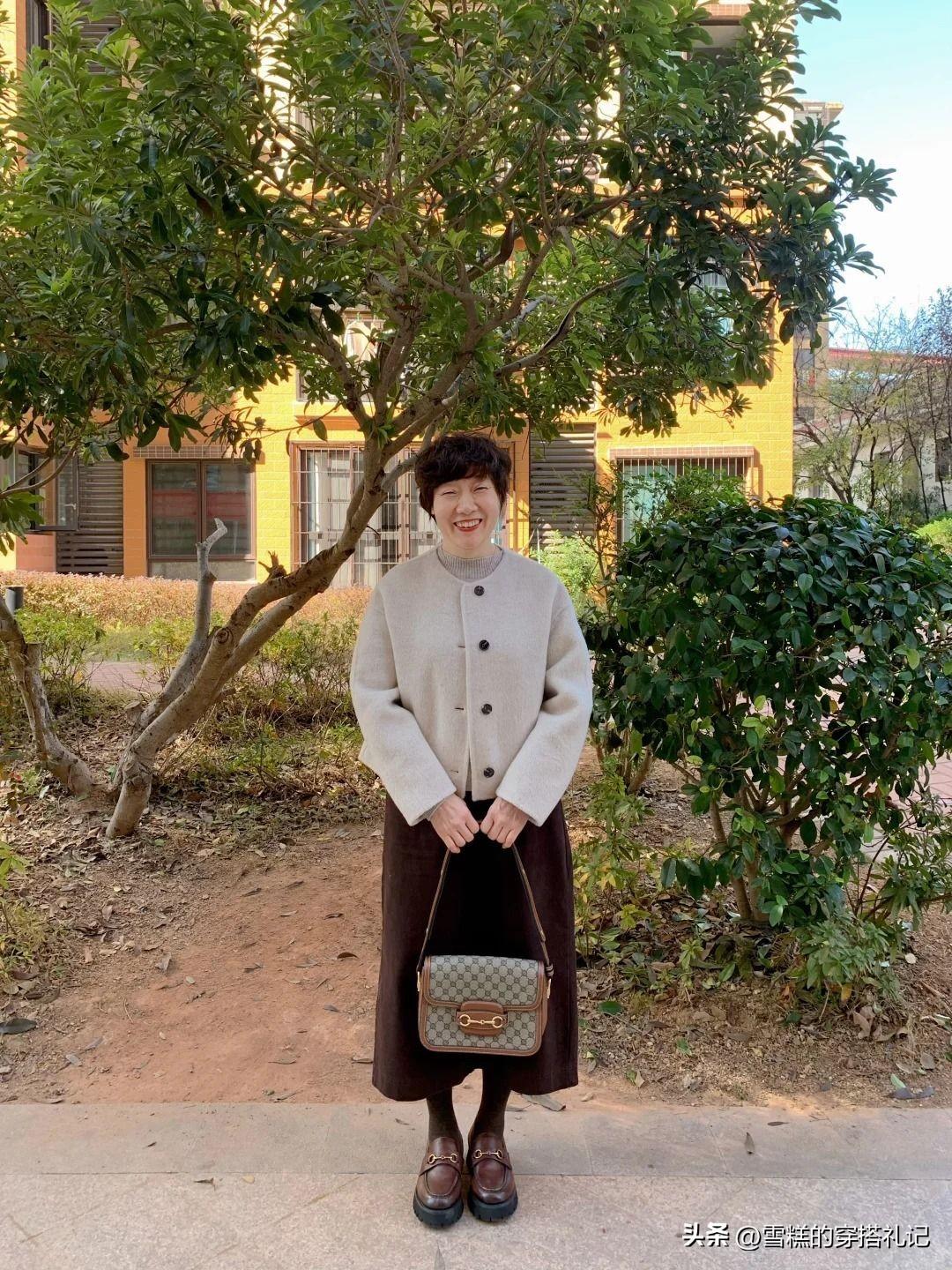 》》》》明黃色羊絨開衫+深棕闊腿西褲,明黃色是比較跳躍的色調,所以選的材質需要比較短,比較有質感,向羊絨、提花織錦類的就自帶光澤,能與之融合增添溫潤貴氣感。而下裝選用的深棕色就是很內斂的色彩,與西褲之間自帶的垂感融合,將內在穩重氣質很好沉澱,視覺上讓上下半身的比例更顯均衡,避免了大面積明黃色造成的視覺壓迫。