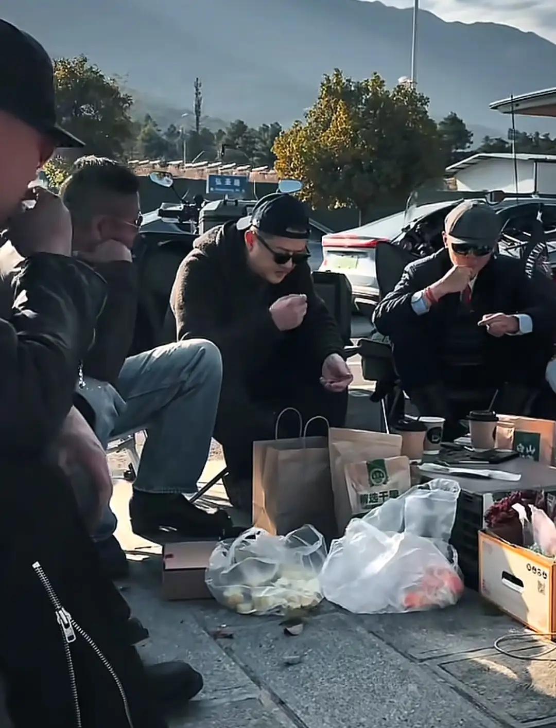 他們一行人在街邊嗑瓜子、喝咖啡、曬太陽、聊天。雲南的紫外線還是非常強,大家都戴着墨鏡。