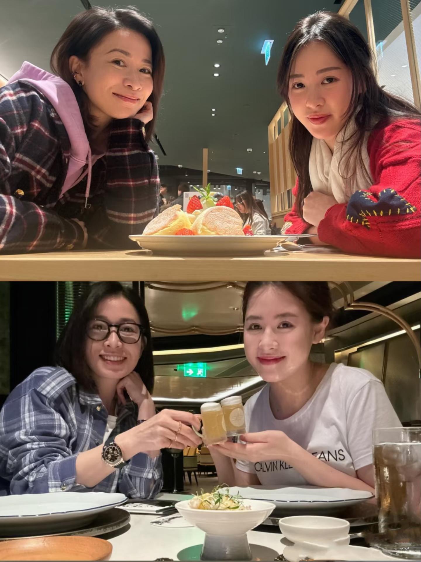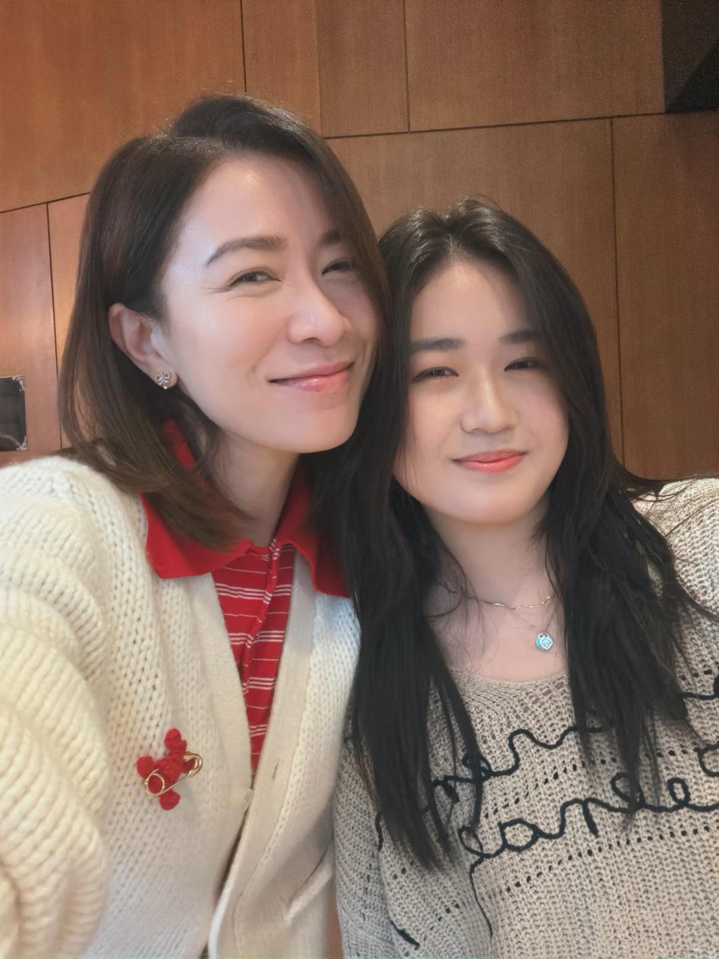 佘詩曼眉眼淺笑,她特別溫柔。和大契女貼臉拍照。大契女看着得有十五六歲的年紀了吧,帶着淺藍色鎖骨鏈、留着微卷的長髮,模樣更加溫柔。