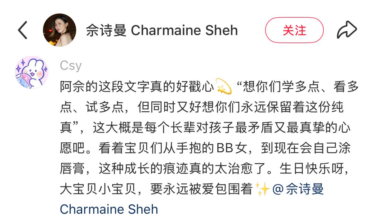 佘詩曼還配了特別溫暖治癒的文字,她寫到:想你們學多點、看多點、試多點,但同時又好想你們永遠保留這份純真“