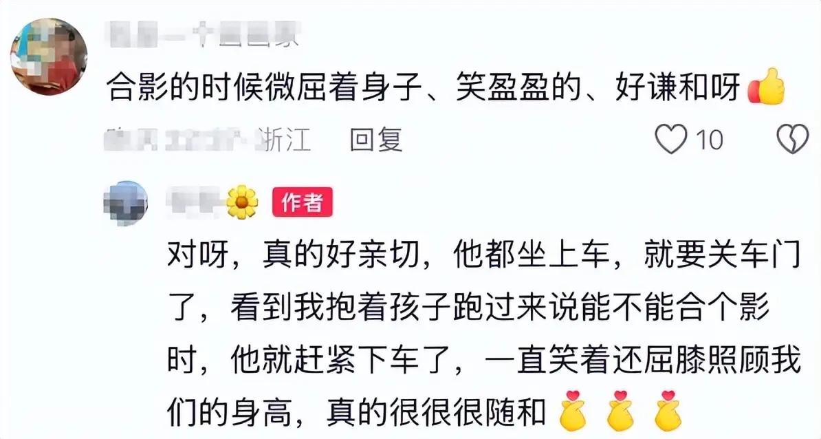 網友還解釋說,撒貝寧屈膝合影,稍微躬着身子,主要是照顧“我們”的身高。生活中的撒貝寧笑盈盈的、特別謙和。
