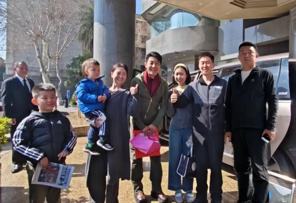 撒貝寧攜妻兒回武漢,躬身和網友合影數他最高,穿厚底鞋得有180
