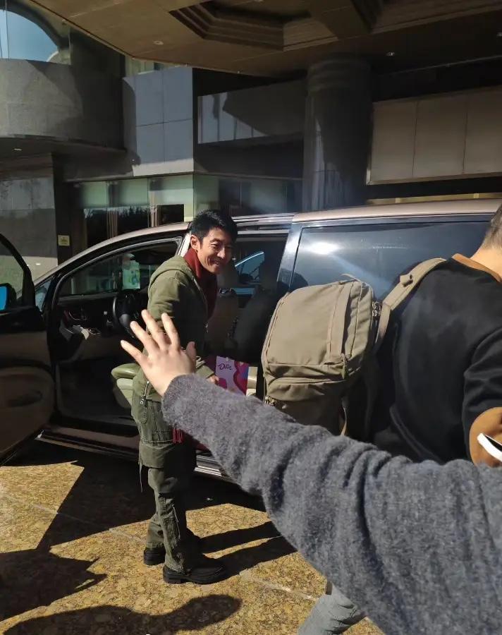 這一次在酒店門口被網友偶遇,撒貝寧穿綠色上衣、工裝褲子,系紅圍巾。看着很喜慶,和他打招呼的時候也很友好,沒有明星架子。