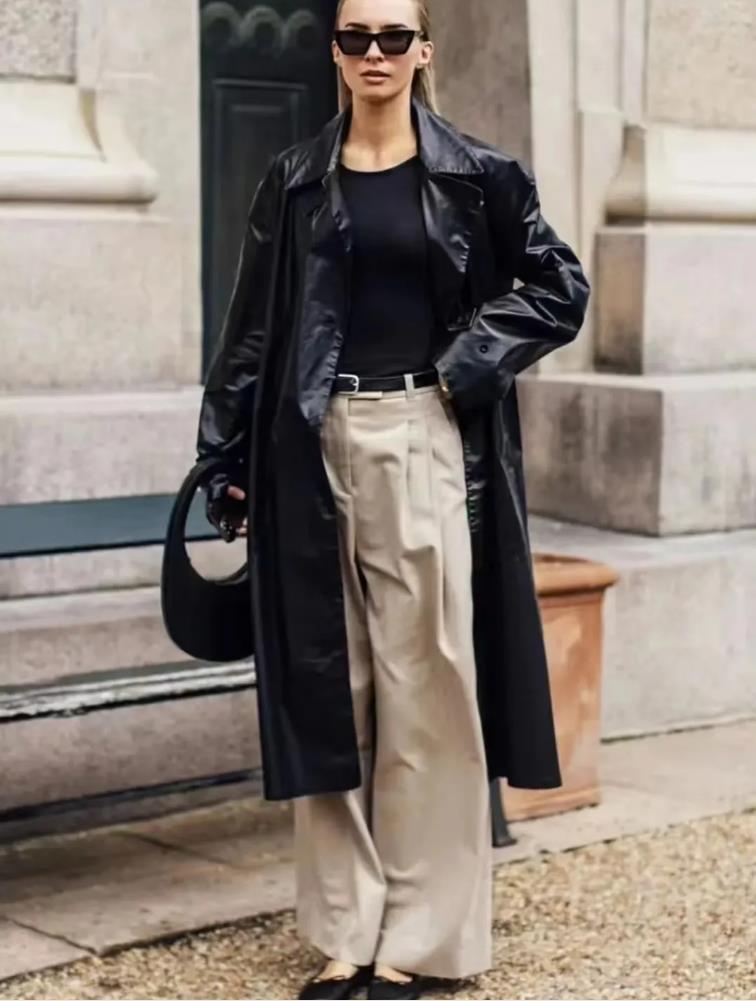 穿多了卡其色風衣,這個早春也可以試試皮革材質的長風衣,選擇黑色打底來配,下身再配上一條卡其色褲子,整個造型瞧着就蠻中性的,還不失英氣,腳上踩着的圓頭單鞋看起來也非常不錯,很舒適自在,也不失時髦感。