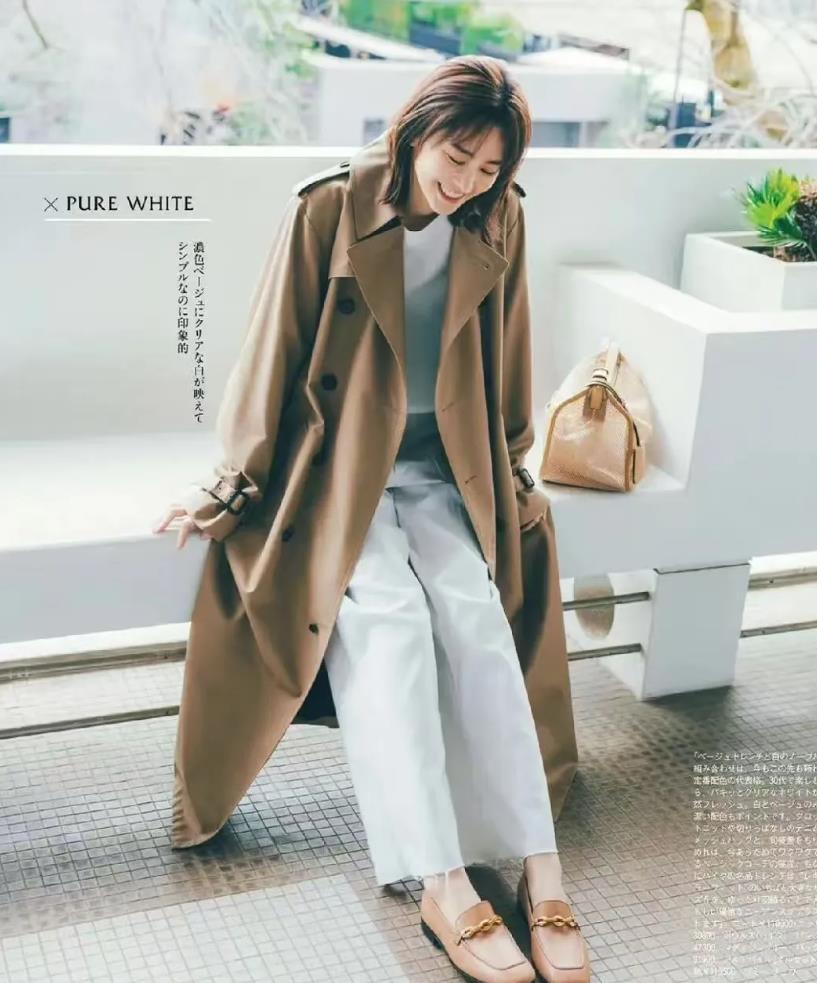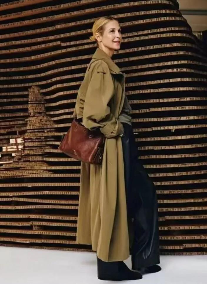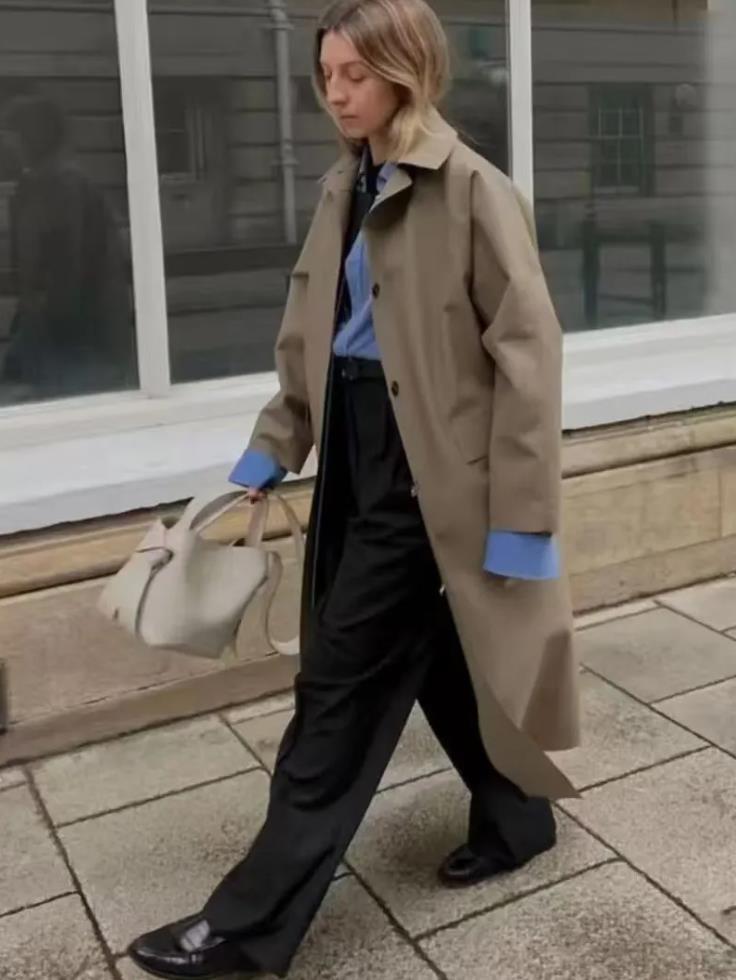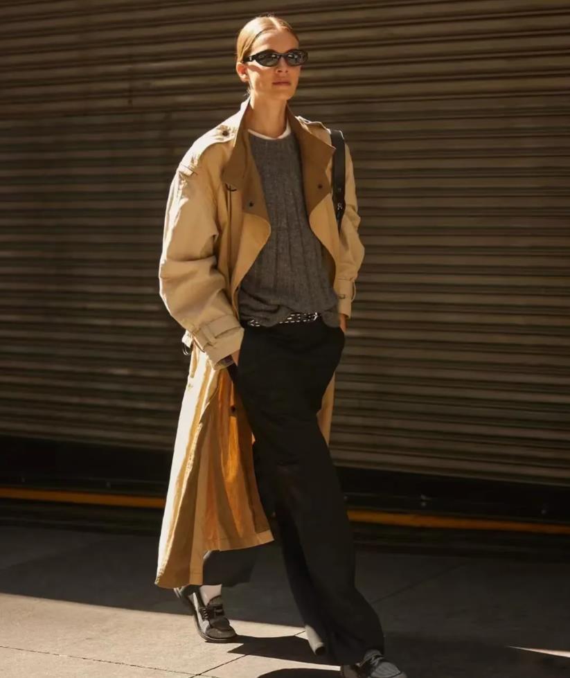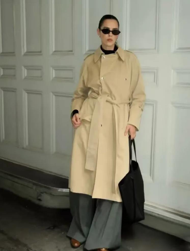 或是喜歡極簡幹練風的,可以換成經典卡其色風衣,內搭配藍色襯衫,利用清爽的顏色來打破造型的沉悶感,下身選擇一條黑色闊腿褲,從而在視覺上拉長腿部線條,手裏再提着一個米白色包包作爲點綴,時髦又溫柔。