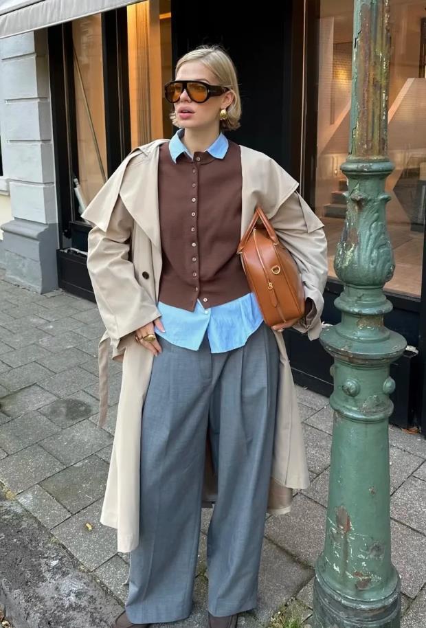自然了,想穿出不同的風格,也可以試試在風衣裏進行疊穿,藍色襯衫和棕色針織開衫的組合,再配上一條灰色闊腿褲,層次感的造型,就是看起來很耐看豐富。
