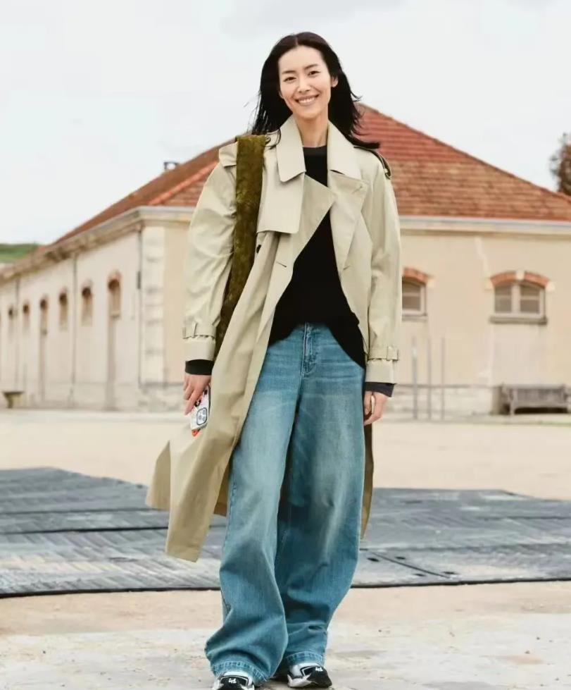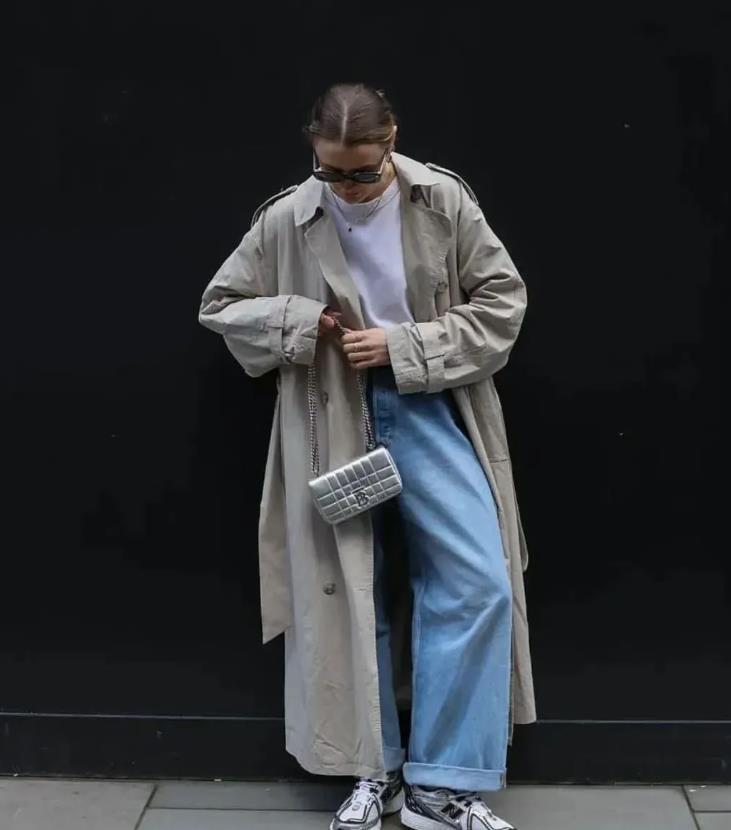 如果你說,怎樣才能將風衣穿得隨性和慵懶的話,不如試試配牛仔闊腿褲吧,當硬朗的牛仔闊腿褲出現在風衣的造型裏,自由、不羈,輕鬆的狀態就呈現了,這時,再配上一雙運動鞋,很顯颯爽又帶着幾分閒適感。
