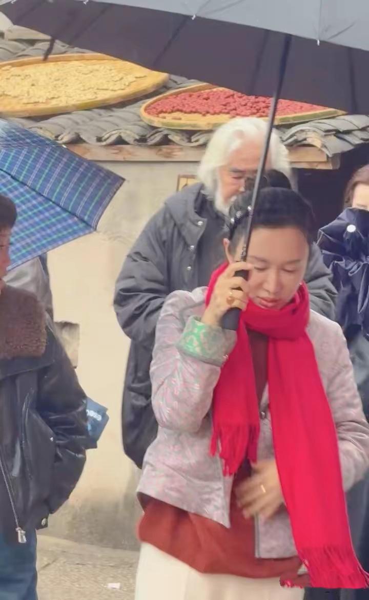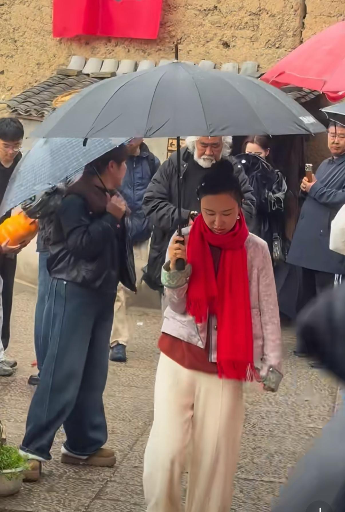 當天下起了微微細雨,遊客們都紛紛撐起了雨傘。杜星霖穿淺粉色新中式上衣、搭配白色褲子、紅色圍巾,時髦又喜慶。