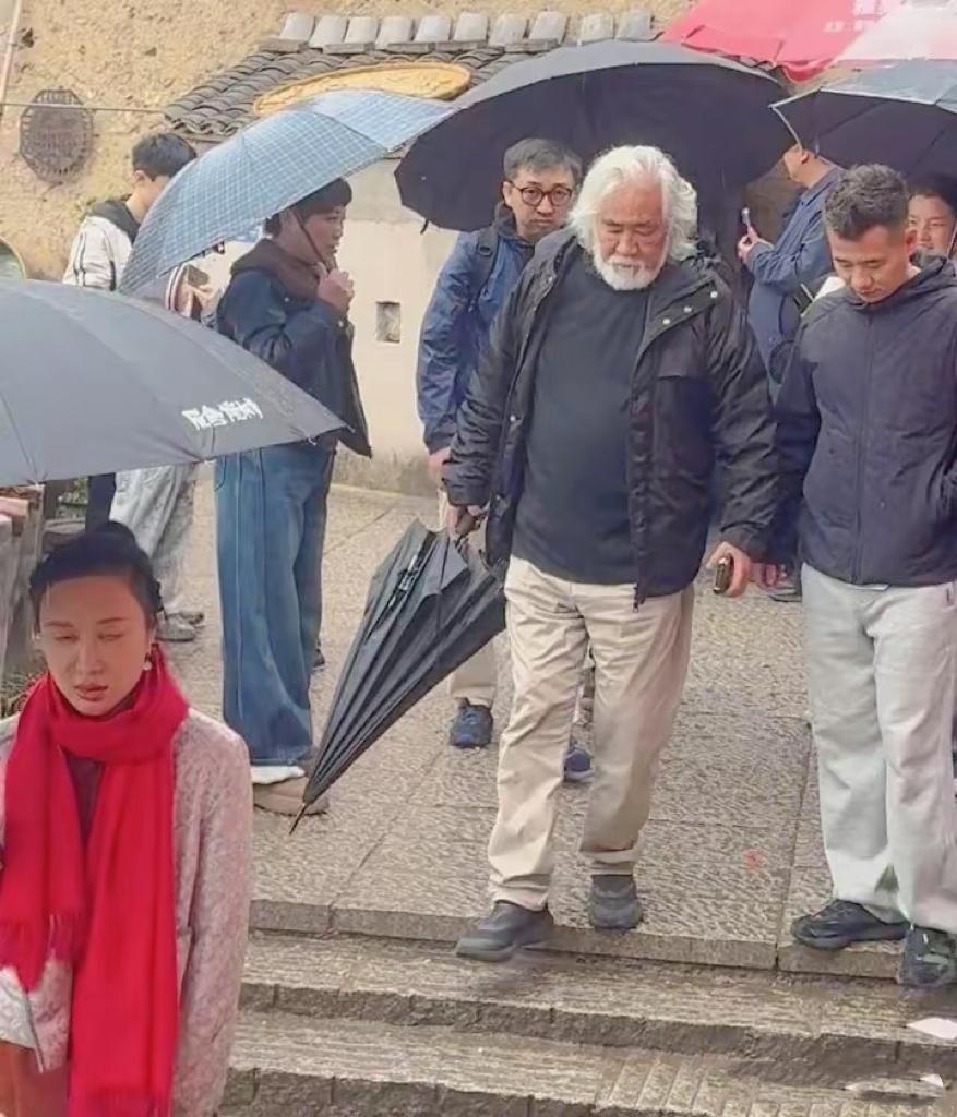跟在杜星霖身後的張紀中,很顯然有些力不從心。手裏的傘沒有撐起來,走臺階的時候有些顫巍巍的,身旁跟了一位助理,小心翼翼的守護着,時刻準備攙扶。