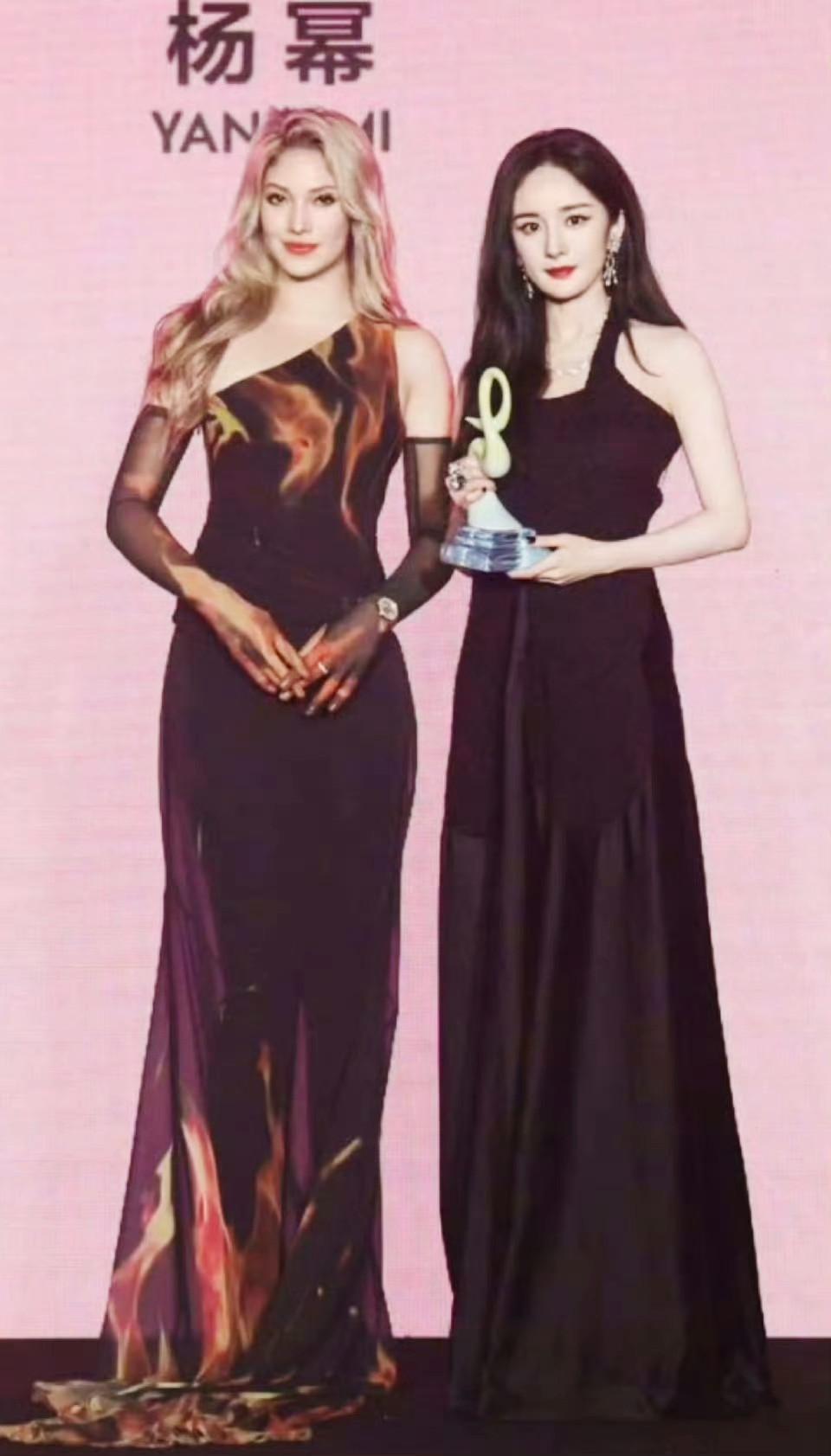 第三套造型是與內娛頂流楊冪同場時的半肩式火紅圖案裙,氣場強大,驚豔全場。紅色寓意“弘景鴻圖”,自帶熱烈張揚氣質,半肩設計露出流暢肩頸線條,彰顯自信大方;裙襬火紅圖案精緻有層次,融合東方美學與時尚設計感。