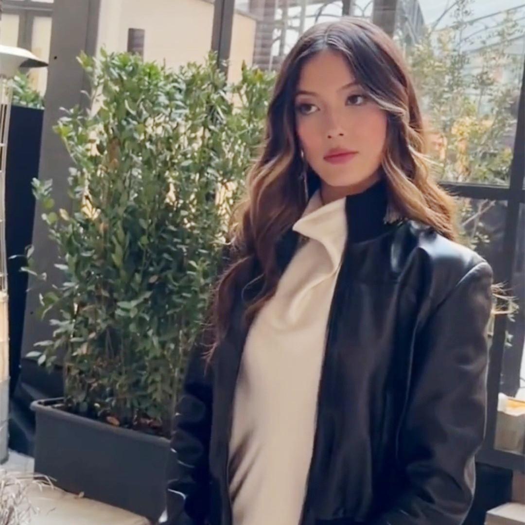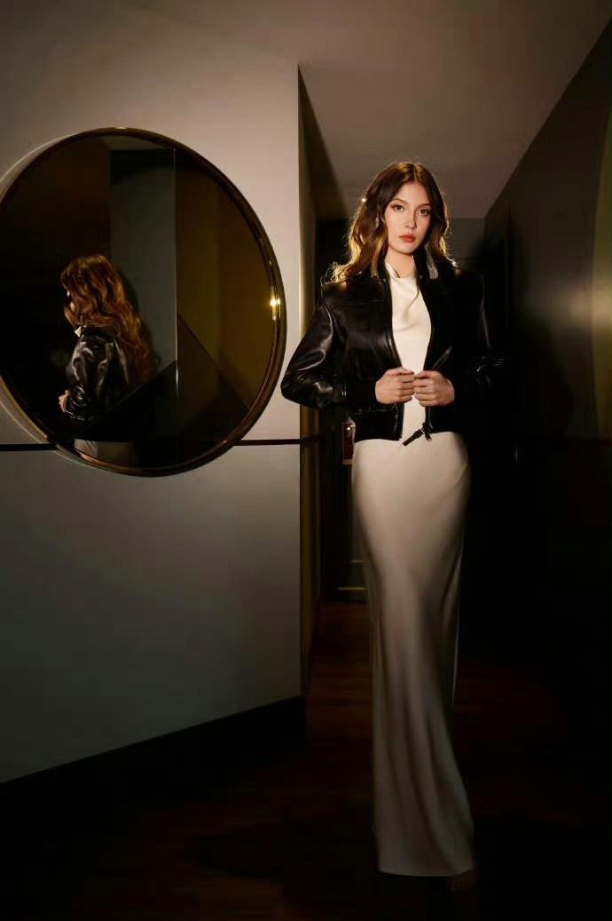 絲綢面料細膩順滑,垂墜感十足,勾勒出高挑身材線條,高領設計溫婉大氣,旗袍版型自帶東方韻味,盡顯東方女性的柔美優雅;外搭黑色皮衣,利落線條與硬朗質感中和了旗袍的柔美,增添酷颯英氣,一剛一柔間,反差感拉滿。