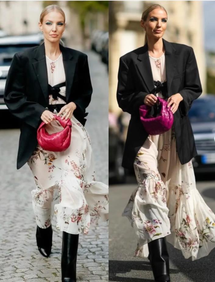 當然了,黑色西裝與黑白配的小碎花連衣裙搭配一起,也是很好看的,整體簡約又不失細節感,沉悶的黑色,正因爲有了小碎花的點綴,才變得更加有韻味起來。