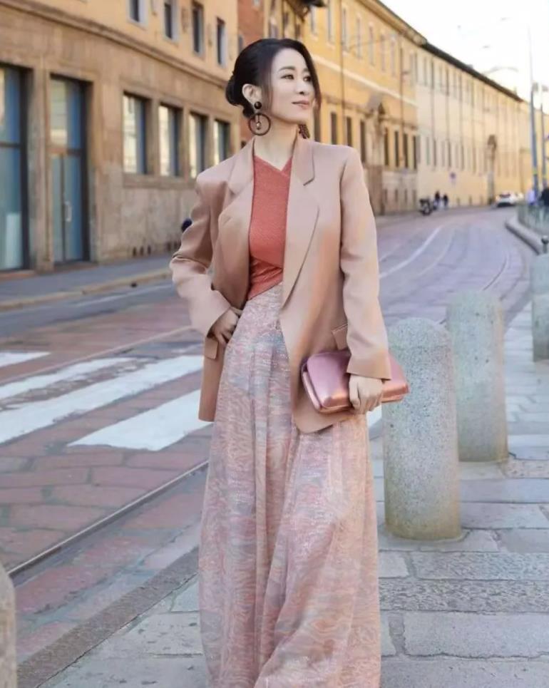 記得舒淇也有類似的穿搭,就在不久前的頒獎活動裏,她穿着一件黑色西裝,搭配薄紗長裙,整體看起來也太優雅氣質了,這麼穿美得十分高級。