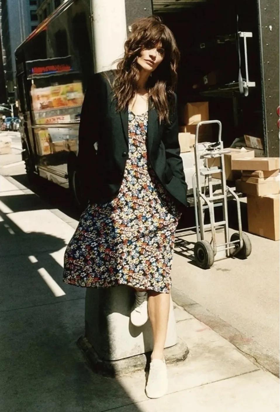 黑色小西裝搭配彩色的碎花連衣裙,簡繁組合,碰撞出不一樣的美感,出門再穿上一雙小白鞋,輕鬆舒適又時髦。