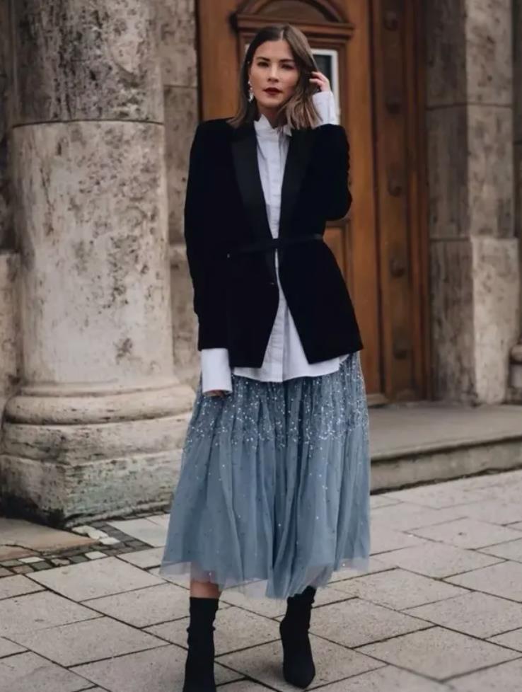 也可以換成黑色絲絨材質的西裝,內搭白色襯衫,記得要把袖口露出來一些,能打造出層次感。下裝搭配灰藍色亮片薄紗裙,輕盈又溫柔,裙子的柔和正好弱化了黑西裝的硬朗,再穿上一雙黑色尖頭短袖,完美與之呼應,整個色調和諧又統一。