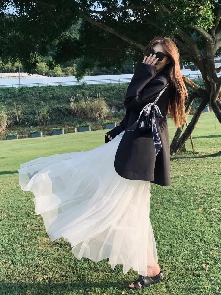 黑色西裝,看起來多少是有些顯沉悶和壓抑的,搭配黑色薄紗裙,腳上再踩着一雙繫帶高跟涼鞋,輕鬆打破沉悶氣息,走路間都自帶靈動,整個身形比例看起來也很顯瘦顯氣場,溫柔又帶着幾分颯爽。