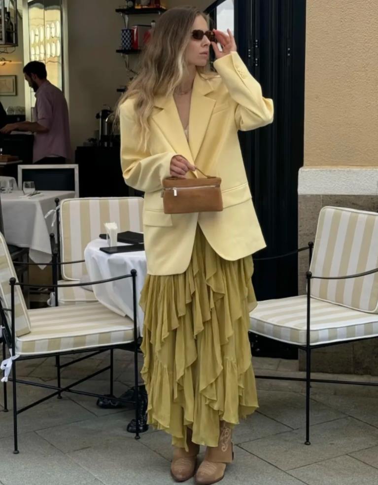 偏愛法式風穿搭的,可以試試這一套,鬆弛與復古的混搭,奶油黃西裝外套,這個色調真的非常溫柔,搭配同色荷葉邊半身紗裙,層層疊疊的皺褶感,營造出浪漫的氛圍。腳上再踩着一雙淺棕西部靴,瞬間多了幾分帥氣,手裏拎着個棕色包包,與靴子顏色完美呼應起來。