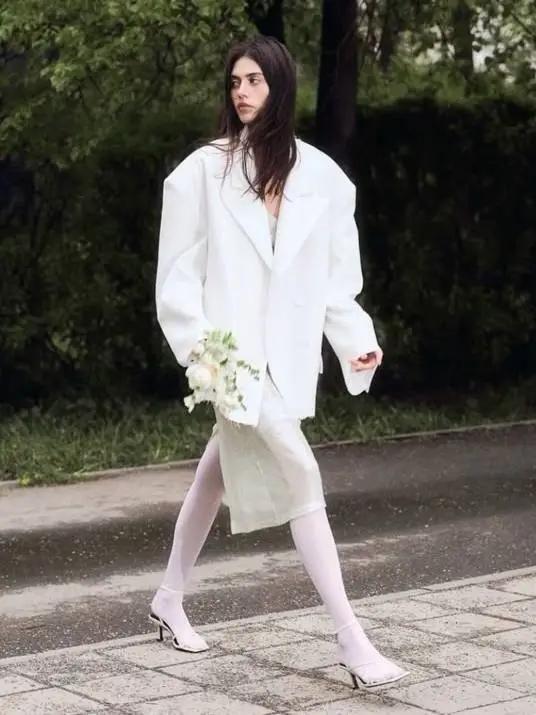 小白裙的款式是很豐富的,只要是白色的,就能與大多數的西裝相配,從白色紗裙、針織裙到蕾絲裙,無論你選擇的西裝是修身的,還是寬鬆的,都可以讓你的造型變得靈動自然起來。