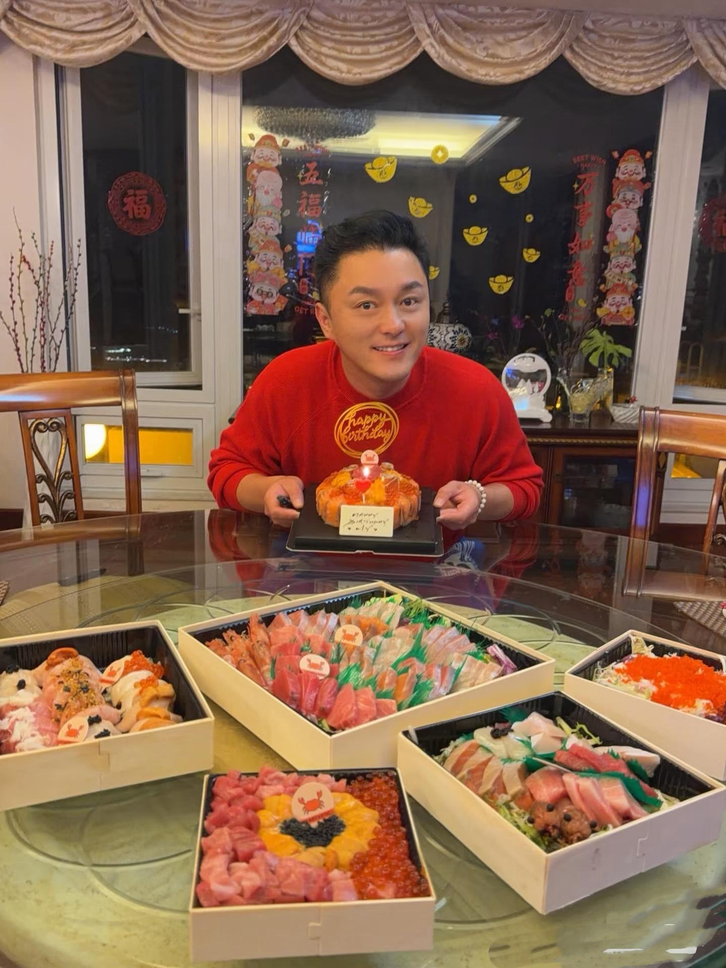楊明穿一件紅色衛衣、藍色闊腿褲,看着以前都不老。而且他們準備的生日蛋糕也挺有意思,並不是普通奶油蛋糕,而是三文魚刺身蛋糕。
