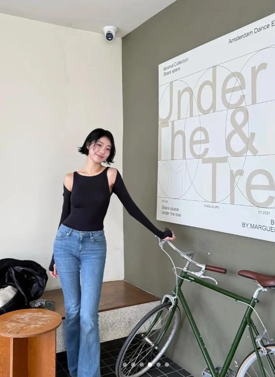 比如一件皮衣夾克外套,搭配寬鬆的淺藍色直筒褲,是一種比較鬆弛自在的美。這種休閒風穿搭,就更加日常也適合旅行度假。