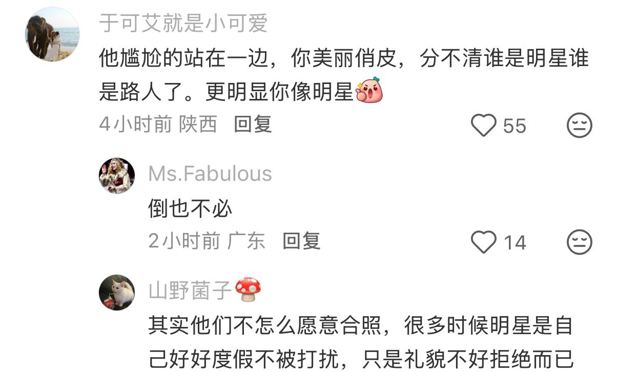 其實很多明星在被偶遇的時候並不願意合照,也只是想好好度假不被打擾,而出於禮貌又不是很好拒絕,所以總是一副蔫蔫的、不情不願的感覺。