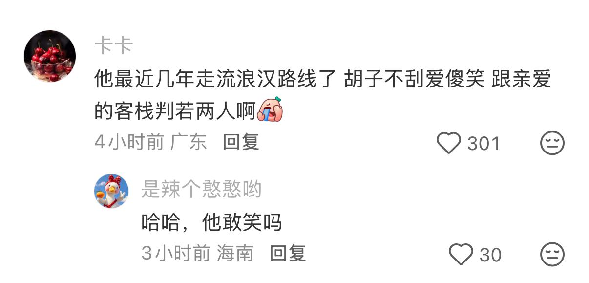 也有網友說這幾年他走的就是“流浪漢”路線,鬍子不刮、愛傻笑,和在《親愛的客棧》裏面簡直判若兩人。