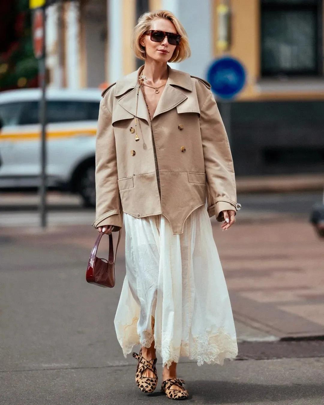 誰又敢說,一身寬鬆的打扮顯得過於拖沓呢?上短下長的組合,就能很好塑造出你想要的完美比例。寬鬆短風衣+白色長半裙,大裙襬隨着你走路搖曳生姿,真的很美,有種既颯又溫柔的氣息。