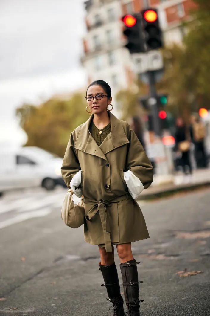近幾年來,下裝玩“失蹤”的穿法是太流行了,而且,不得不承認的是這種穿法非常受小個子女生青睞。時尚又充滿個性,這個早春,選擇一件版型利落的短風衣,最好是繫腰帶的那種,可以很好展現出你的身材線條,最好長度是剛好遮住臀部的。