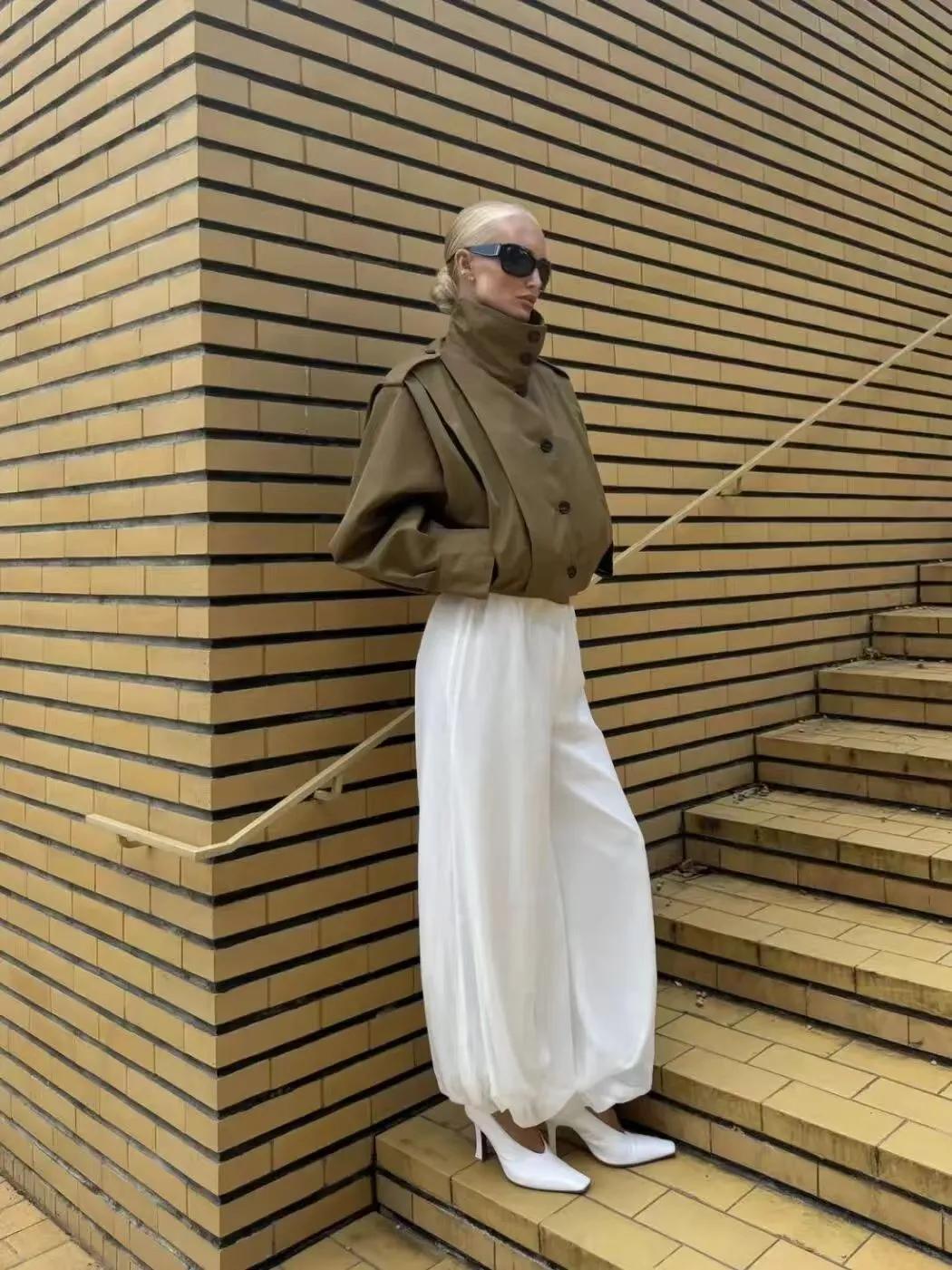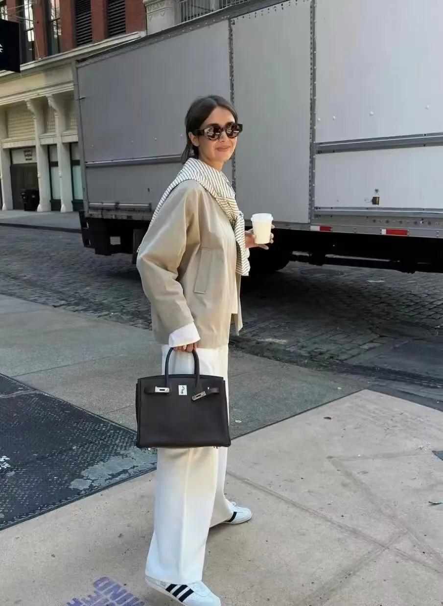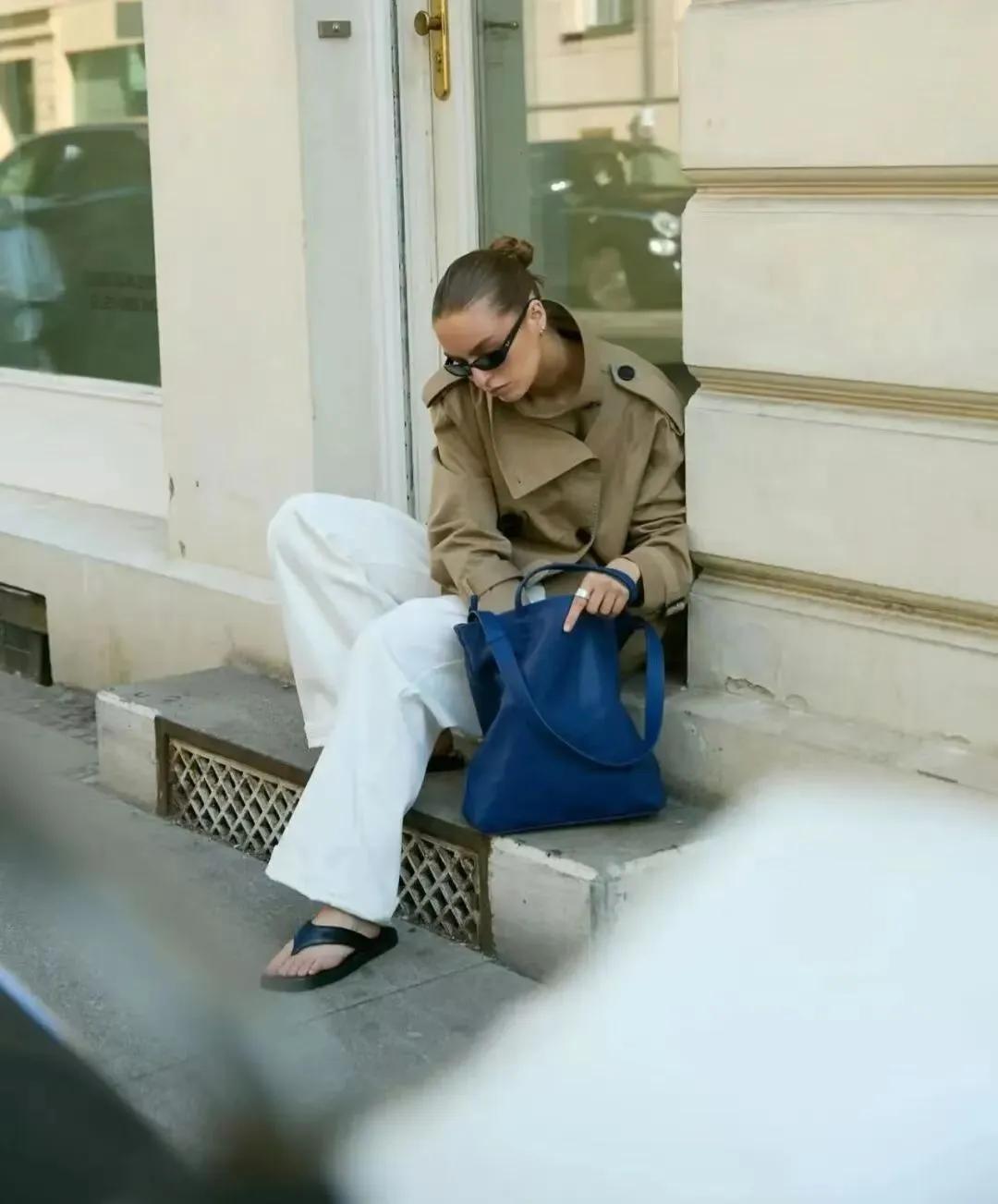 現下慵懶鬆弛感的着裝也是非常受歡迎的了,卡其色短風衣+白色闊腿褲,隨性又耐看,出門的時候隨便踩着一雙黑色人字拖,整個造型自帶慵懶,還不會顯得太拖沓,鬆弛感與高級感恰到好處。