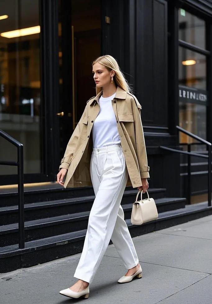 還有這種淺卡其色的短風衣,看起來就非常簡約好看,內搭一件白色襯衫,氣質感十足。下身配一條白色直筒褲,多了幾分清爽,再選擇一雙白色運動鞋,舒適自在,很好弱化了正裝感,增添了幾分日常休閒氣息,耐看又不失質感。
