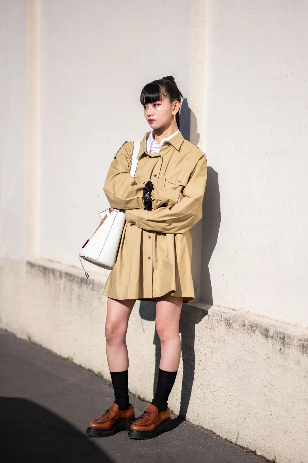 或者想玩點學院風的,也可以選擇一件卡其色短風衣,寬鬆版型的款式,對身材包容性極佳,內搭白色襯衫,記得要露出一些襯衫的衣領,營造出層次。風衣的長度稍微遮掩住臀部,腳上再配一雙黑色小皮鞋,多了幾分溫柔與乖巧。
