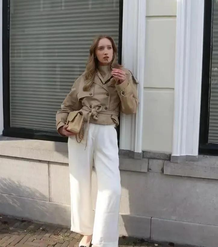 小個子的女生,一定要試試短風衣的搭配,這可是一套春日裏最顯高挑和顯白的組合,很是乾淨利落,配色也很清爽,白色的褲子,能很好弱化風衣帶來的硬朗,溫柔且高級,隨隨便便一穿就能打造出春天的氛圍感。