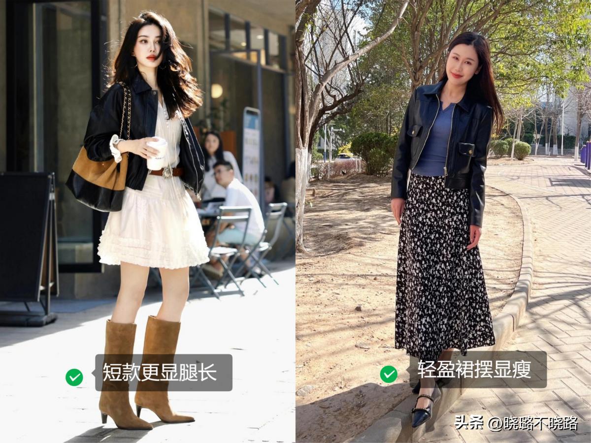 短款直筒型的皮衣是首選,利落又不壓身高,裙子就選選剪裁乾淨款式,避免太多元素堆砌。但一定要注意比例的突出,皮衣不要選擇超過胯的位置,裙裝都選擇高腰設計。這時候再搭配一雙小白鞋舒服又 chic。