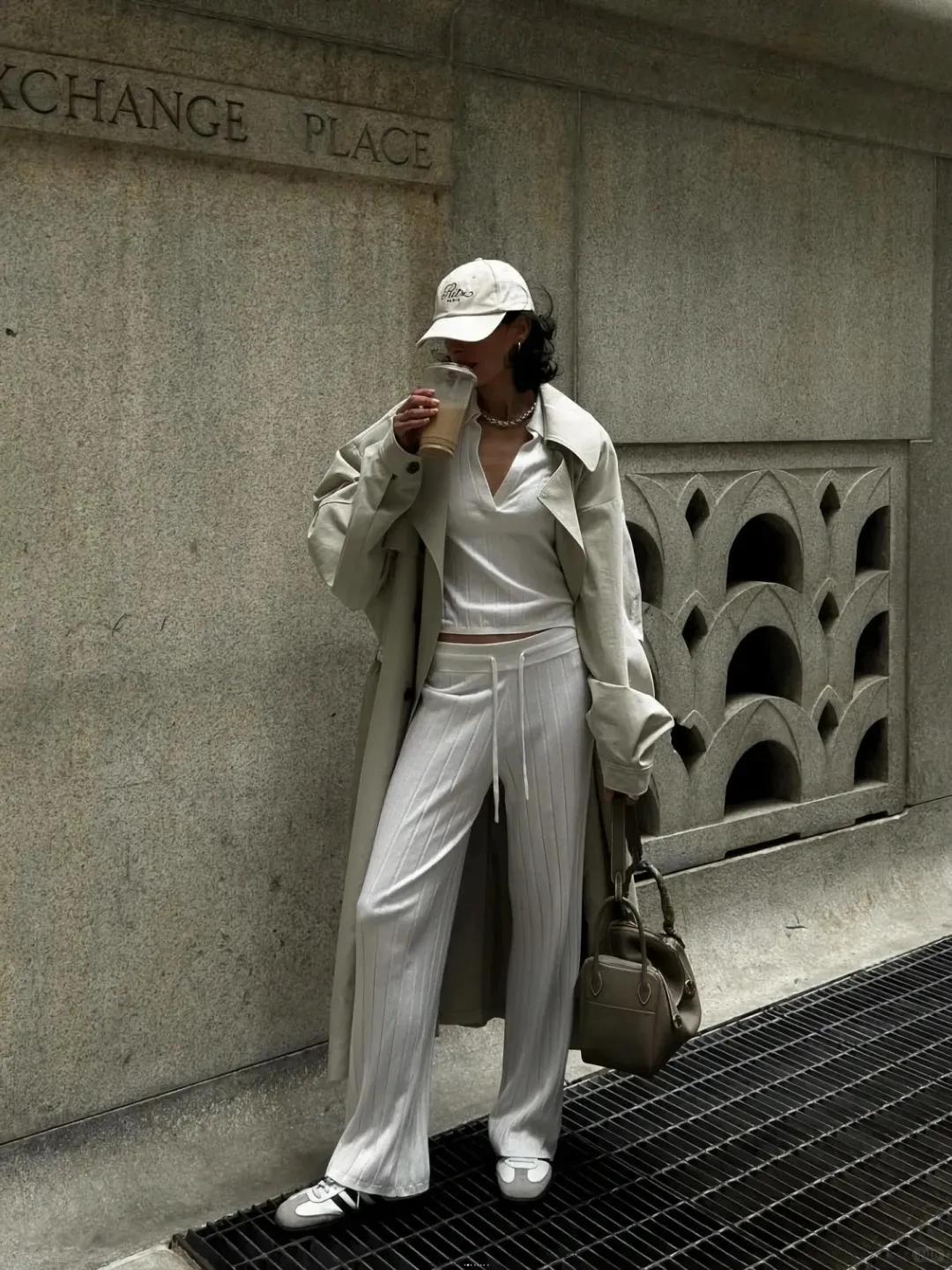 這個春天,還是比較適合穿風衣的,長款杏色風衣,這個色調是真的很耐看和百搭,也帶着滿滿的高級。下面搭配條紋寬鬆運動褲,再加上那雙復古拼色德訓鞋,真的是怎麼舒適怎麼來,一整個鬆弛與隨性。