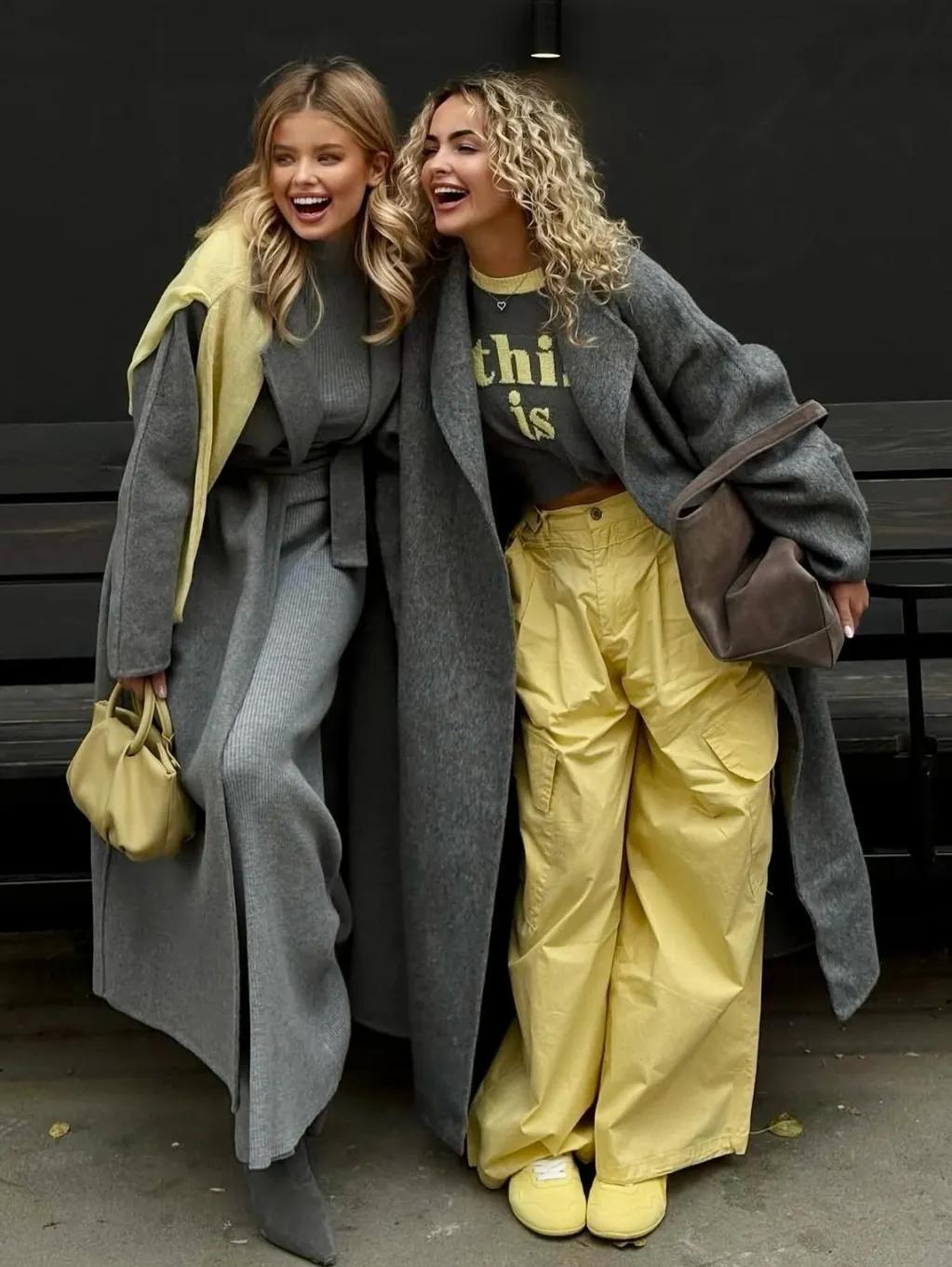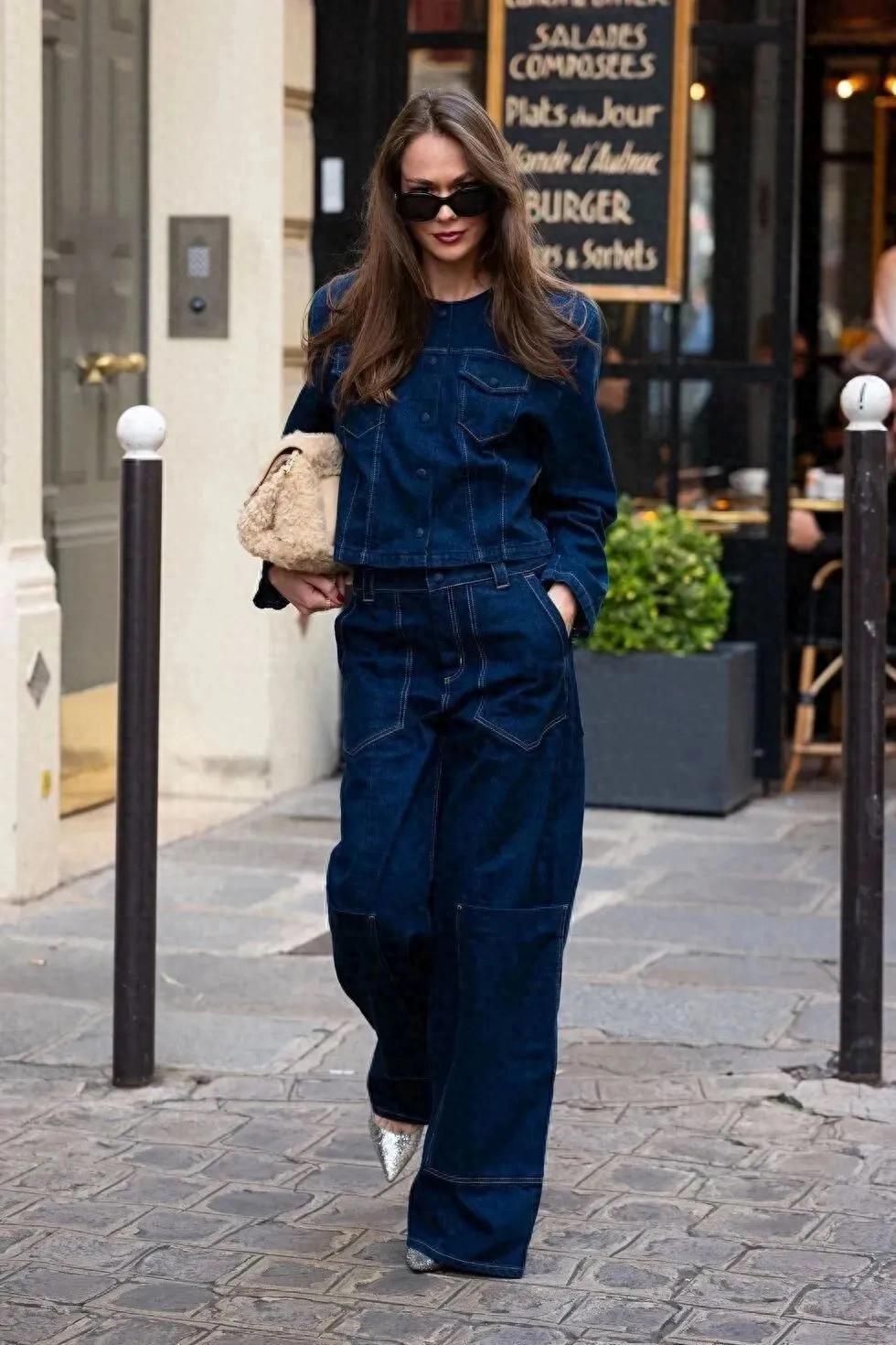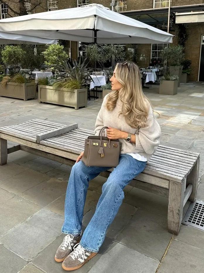 若你更偏愛溫柔的大地色,不妨試試淺色的針織衫,搭配淺藍闊腿牛仔褲,清新的藍色,正好中和掉大地色的厚重,手裏再拎着一個包包,整個色調統一又不單調,和諧感很強,溫柔又不失格調。