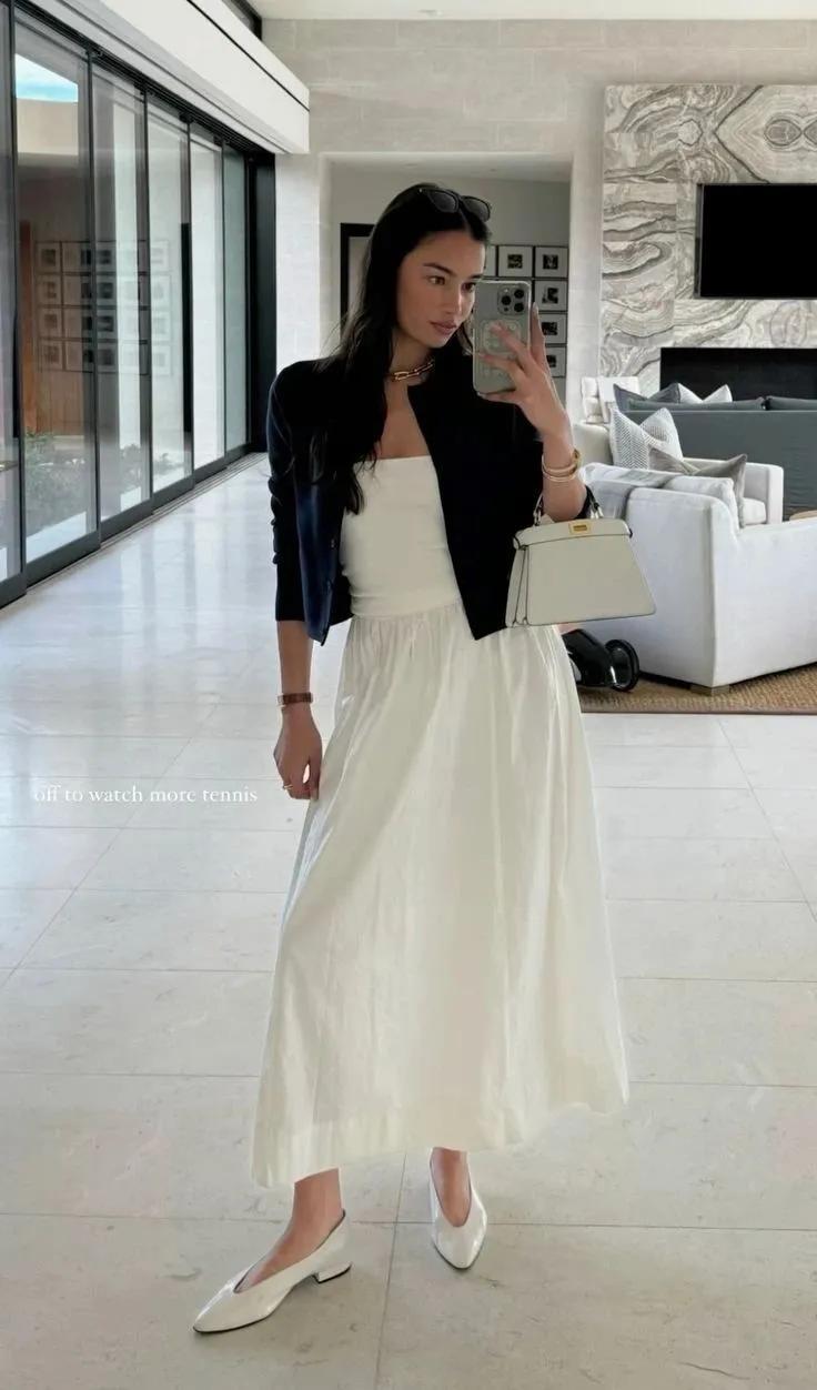 也可以打造幹練利落的氣質,上衣換成黑色圓領短外套,內搭白色修身的吊帶連衣裙,腳上搭配一雙白色薄底尖頭鞋,經典的黑白配就是耐看,高級又顯瘦。溫柔中又帶着幾分利落氣場,不管是日常通勤,亦或者是約會都很合適。