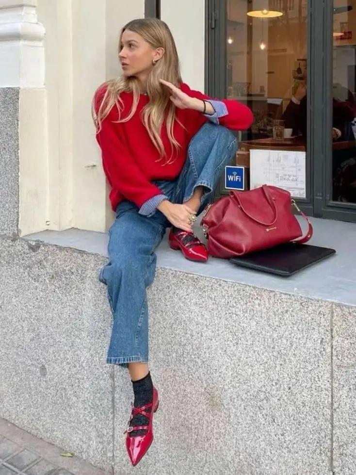 如果偏愛明豔色調的造型,還可以選擇一件紅色毛衣搭配藍色牛仔褲,再穿上一雙薄底的紅色尖頭鞋,手裏的包包也是紅色的,一身紅色與藍色碰撞,亮眼又不失格調,輕鬆成爲春日街頭裏的一抹亮色。