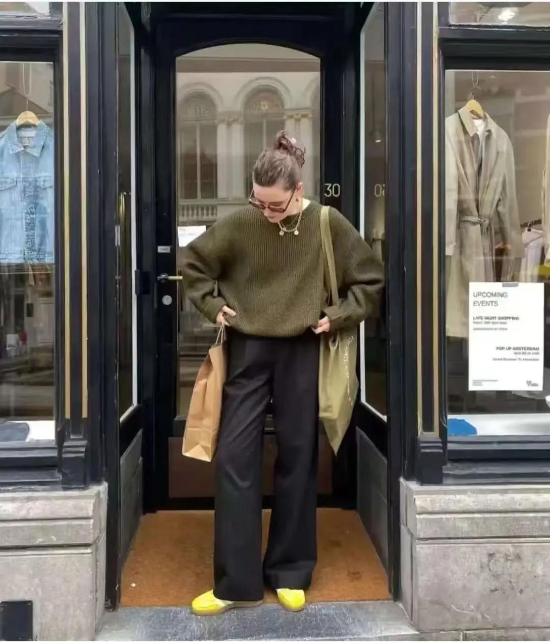 苔蘚綠的毛衣,不得不誇一句,這個色調是真的很襯膚色和顯白,搭配黑色闊腿褲,寬鬆的褲型,最藏肉顯瘦了。經典的黑色+苔蘚綠碰撞,高級感十足。腳下再穿上一雙亮色的薄底運動鞋,讓整個穿搭多了幾分鮮活休閒感。