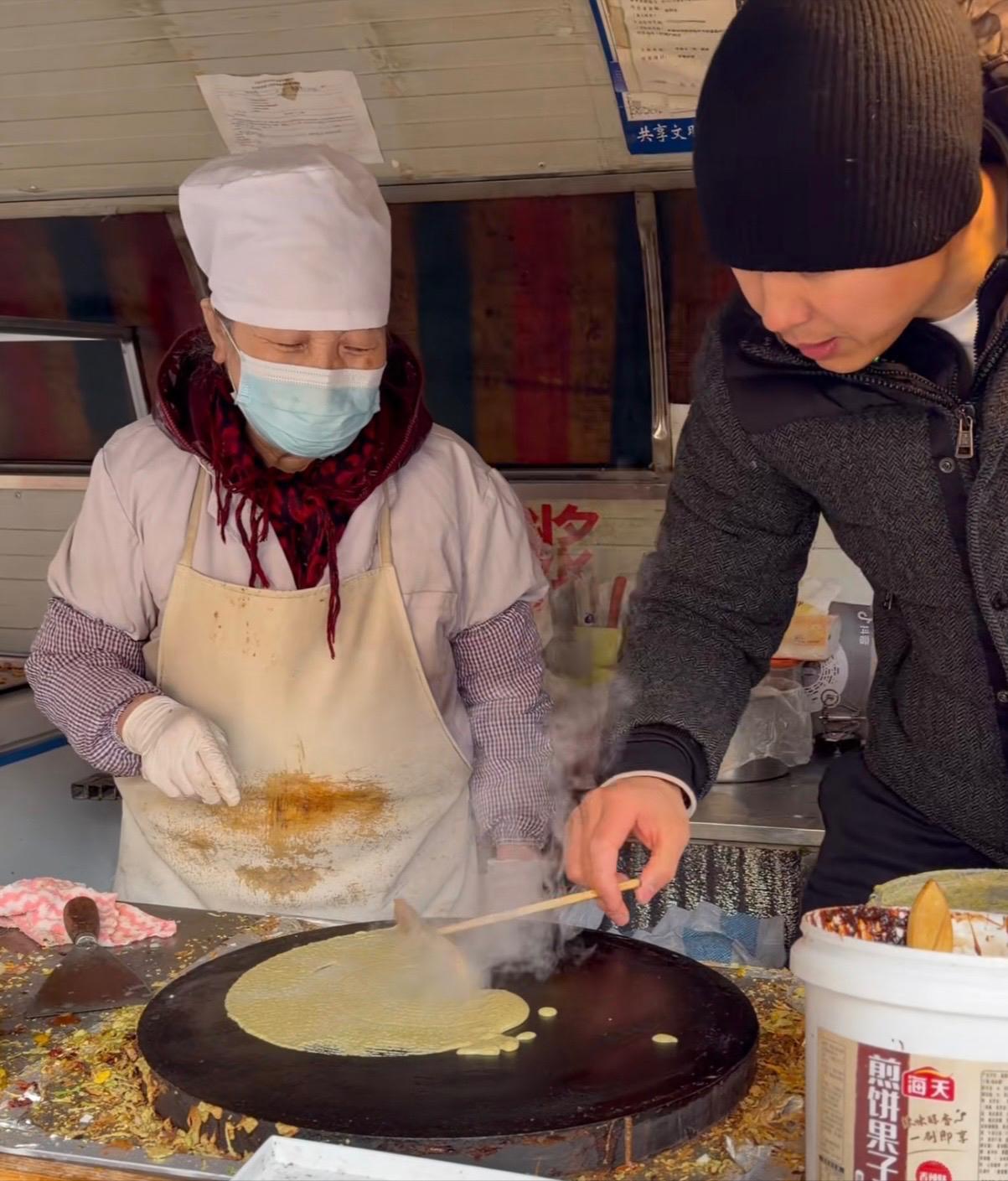 別看高雲翔一個大男人,做起煎餅來還真是有模有樣的。他小心地添加醬汁、芝麻、翻面,老師傅在一旁看着很欣慰。